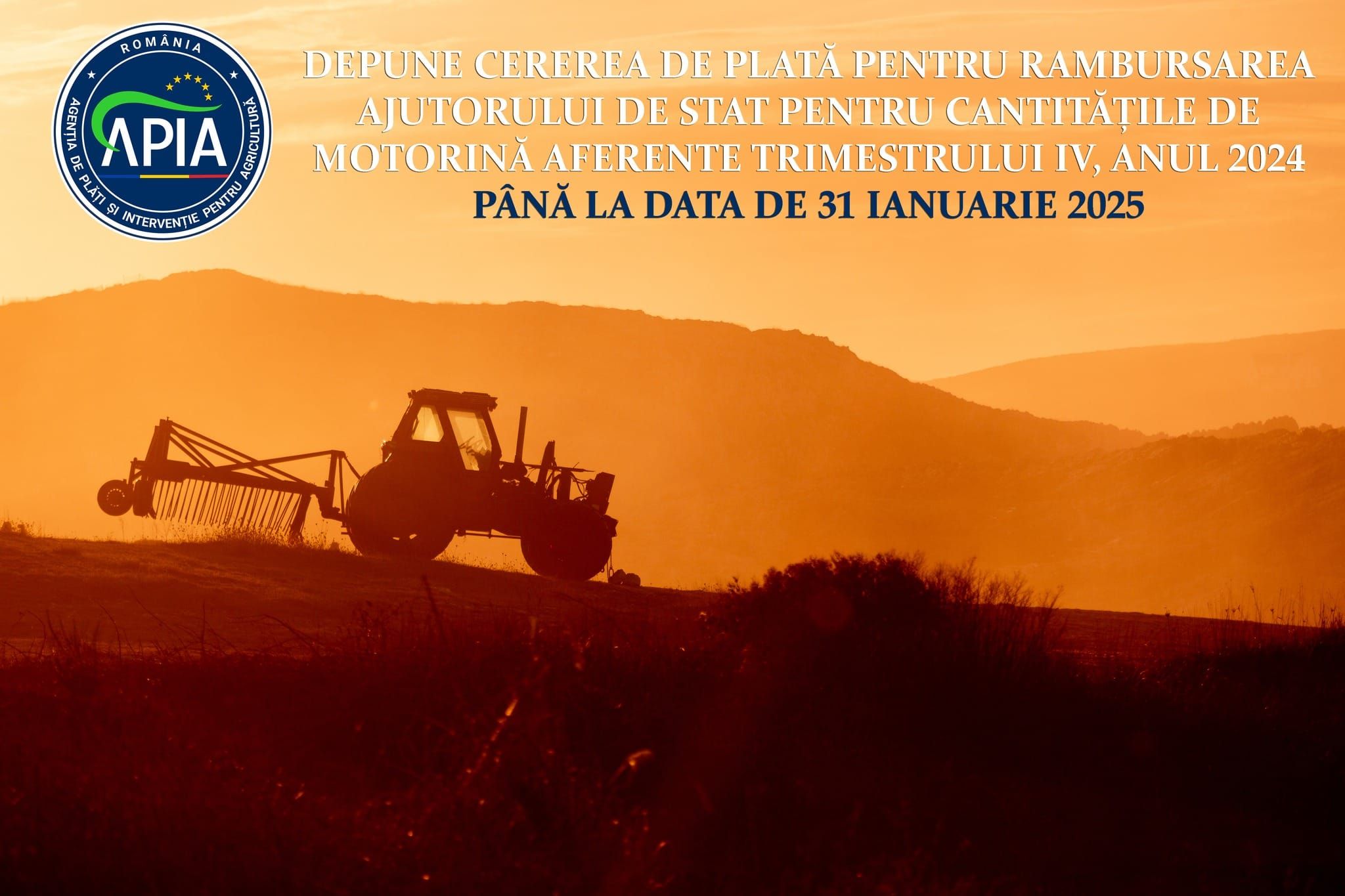 Agenția de Plăți și Intervenție pentru Agricultură (APIA) informează potenţialii beneficiari că până la data de 31 ianuarie 2025 inclusiv, se depun cererile de plată pentru rambursarea ajutorului de stat pentru cantităţile de motorină achiziţionate şi utilizate în agricultură aferente trimestrului IV al anului 2024 (perioada 1 octombrie – 31 decembrie 2024).