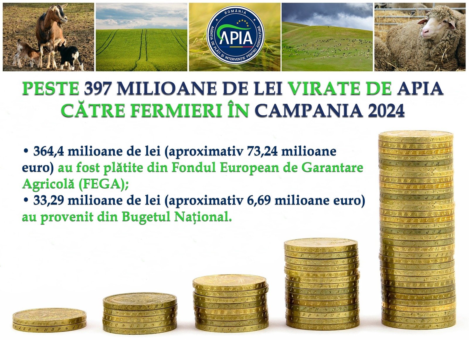Agenția de Plăți și Intervenție pentru Agricultură (APIA) a efectuat, în perioada 20 – 30 iunie 2025, plăți în valoare totală de peste 397,69 milioane de lei, echivalentul a aproape 80 de milioane de euro, în conturile fermierilor care au depus cereri în cadrul Campaniei 2024.