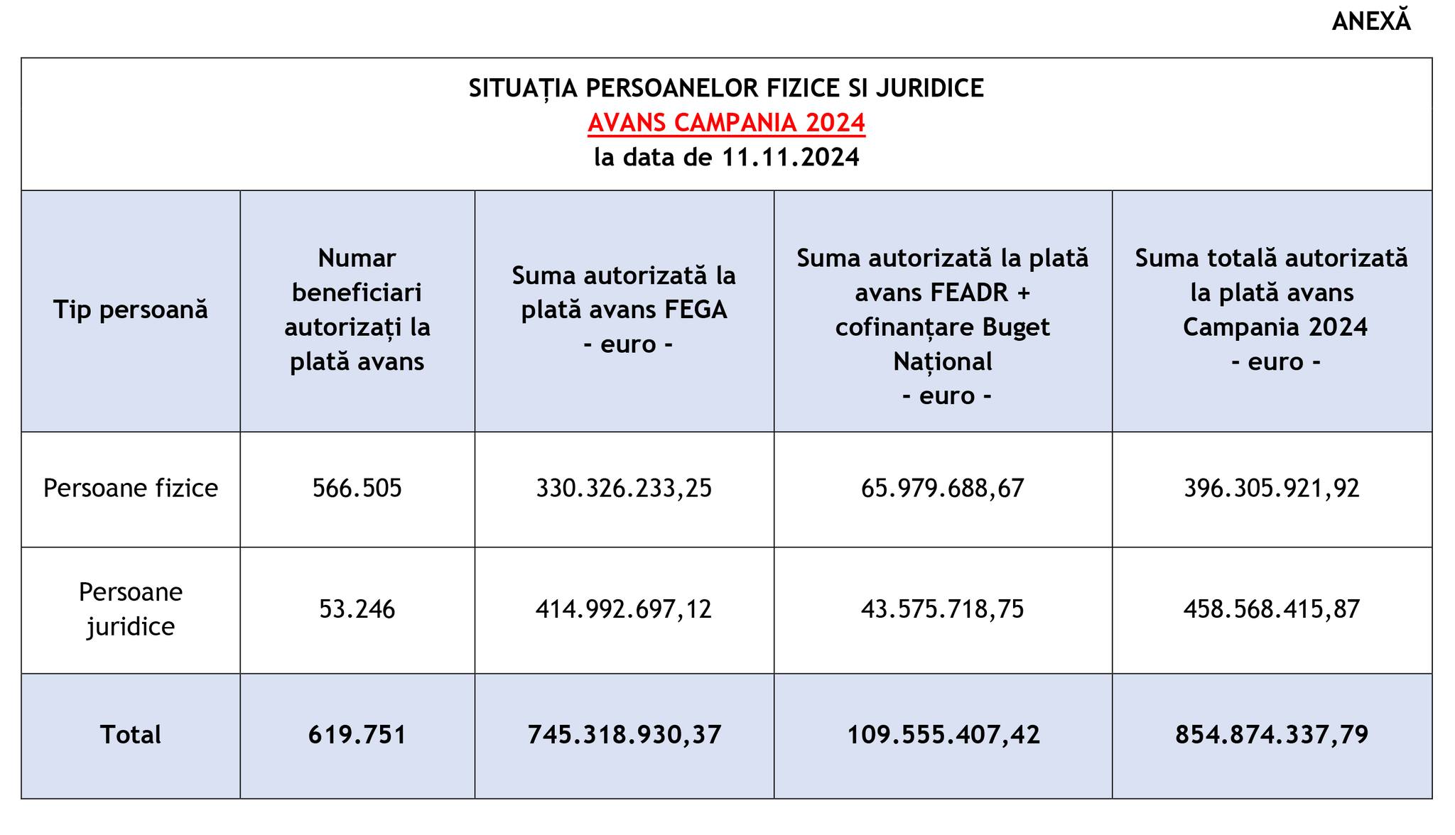 Agenția de Plăți și Intervenție pentru Agricultură (APIA) informează că în perioada 16 octombrie-11 noiembrie 2024, a autorizat la plată în cadrul campaniei de plăți în avans, aferentă anului de cerere 2024, un număr de 619.751 fermieri, cu o sumă totală de 854.874.337,79 euro (4.253.289.059,12 lei).
