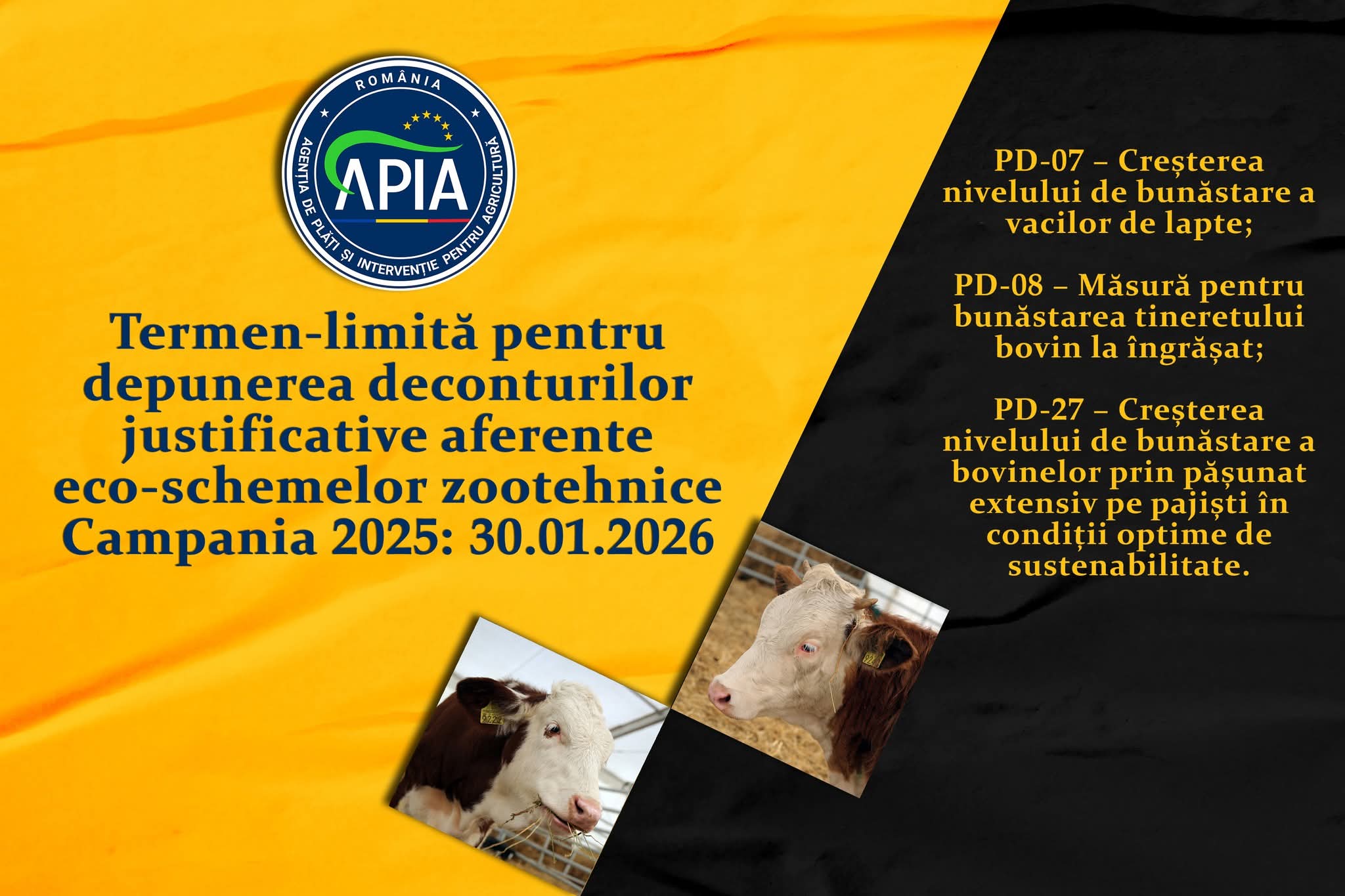 Agenţia de Plăţi şi Intervenţie pentru Agricultură (APIA) informează că, până la data de 30 ianuarie 2026 inclusiv, solicitantii eco-schemelor din sectorul zootehnic, care prin cererea de plată depusă la Centrele APIA în Campania 2025 și-au asumat voluntar angajamente anuale, au obligația de a depune deconturile justificative anuale/semestriale, însoțite de documentele care atestă îndeplinirea cerințelor specifice de bunăstare a animalelor.