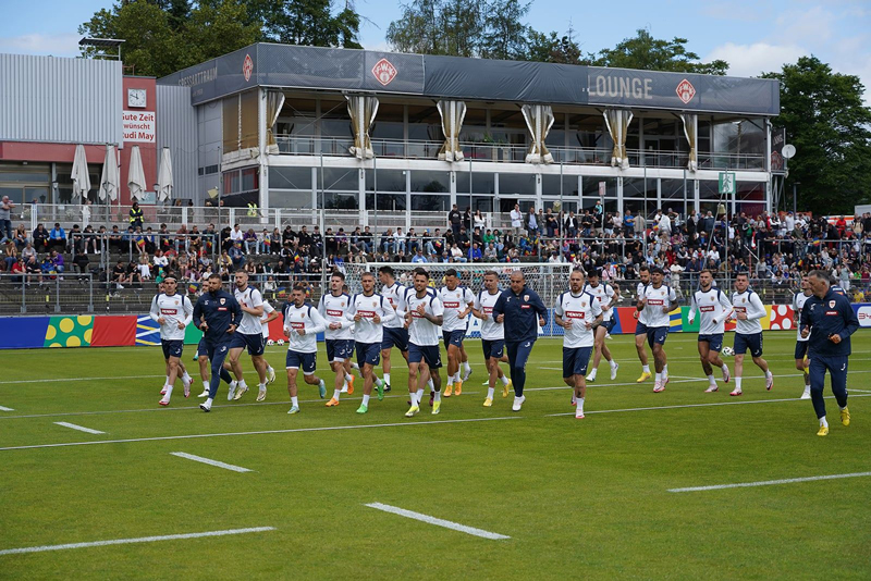 Surpriză copleșitoare pentru fotbaliștii naționalei României la primul antrenament susținut pe pământ german. Elevii lui Edward Iordănescu au avut parte de o audiență peste așteptări. Aproape 4.000 de fani români, cei mai mulți stabiliți peste hotare, au luat cu asalt AKON Arena, acolo unde a avut loc cea dintâi ședință de pregătire a tricolorilor. Stadionul a fost inaugurat în anul 1967 și beneficiază de nocturnă din 2014, iar complexul are două terenuri de iarbă și unul cu suprafață artificială. Naționala României este cazată la Melchior Park Hotel din Wurzburg. Mai multe sectoare ale stadionului au fost pline, iar antrenamentul oficial și conferința lui Radu Drăgușin au fost amânate din cauza agitației de la porți. ,,Suntem bucuroşi să ne aflăm aici şi că mulţi suporteri au venit să ne vadă la antrenament. Şi sperăm să avem un număr mare de fani la fiecare meci pe care îl vom disputa aici. Poate suporterii nu îşi dau seama cât de importanţi sunt ei în momentele dificile… dar un ‘Hai, România’ strigat de tot stadionul îţi dă o energie incredibilă. Este foarte mult entuziasm aici pentru noi… din momentul în care am aterizat am văzut cum am fost primiţi şi câţi români au venit aici pentru noi. Este un sentiment de mândrie să ne aflăm aici pentru că este un lucru pentru care am muncit şi pe care ni l-am dorit”, a explicat Drăgușin.
