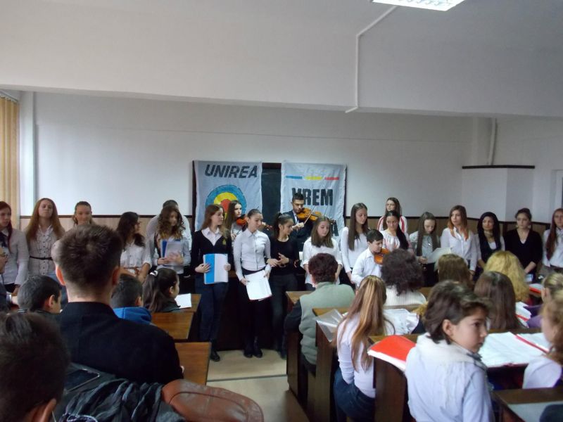 La ora 10, Amfiteatrul e plin ochi: elevi frumos îmbrăcaţi, cu funtiţe tricolore pe frunte sau în piept, profesori, câţiva părinţi, invitaţi. Dl Valentin Chepeneag, copreşedinte al Platformei Unioniste „Acţiunea 2012”, filiala Gorj, arborează două benere cu mesajele „UNIREA, OBIECTIV NAŢIONAL” şi „VREM UNIREA” care ne amintesc de faptul că Marea Unire de la 1 Decembrie se va desăvârşi cu adevărat atunci când ţările române surori, România şi Republica Moldova se vor regăsi împreună într-o Românie în sfârşit Unită. Să se împlinească astfel aspiraţia de atâtea veacuri a românilor, „pohta ce a pohtit” Mihai Viteazul, „ceea ce ţara toată doreşte” (M. Kogălniceanu către Alexandru Ioan Cuza), „această de Dumnezeu binecuvântată Ţară” (Regele Carol I, Testament), pentru care „…am putut desăvârşi opera naţională…prin acea mai scumpă şi sfântă răsplată”(Regele Ferdinand I, Testament).