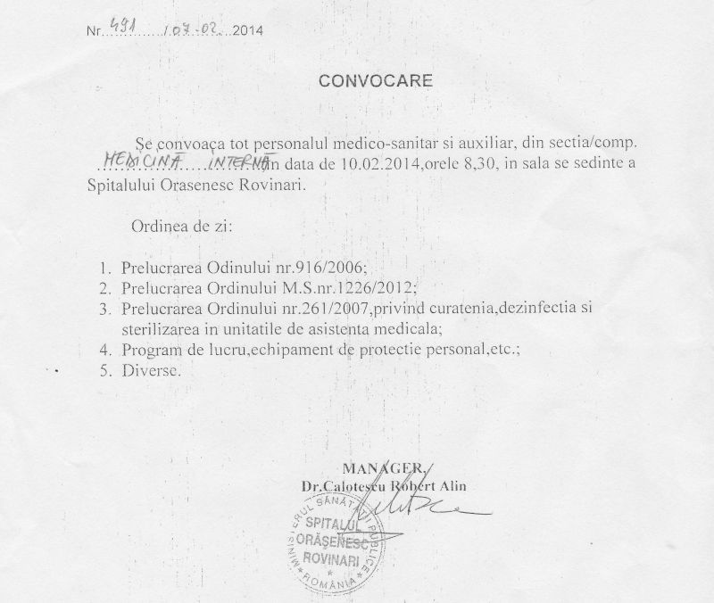 În pofida discordanţei între ceea ce spun sursele şi ceea ce susţine managerul, programul de lucru a fost pe ordinea de zi a şedinţei, la punctul 4, acelaşi punct care cuprindea şi echipamentul de lucru al personalului Spitalului Rovinari.