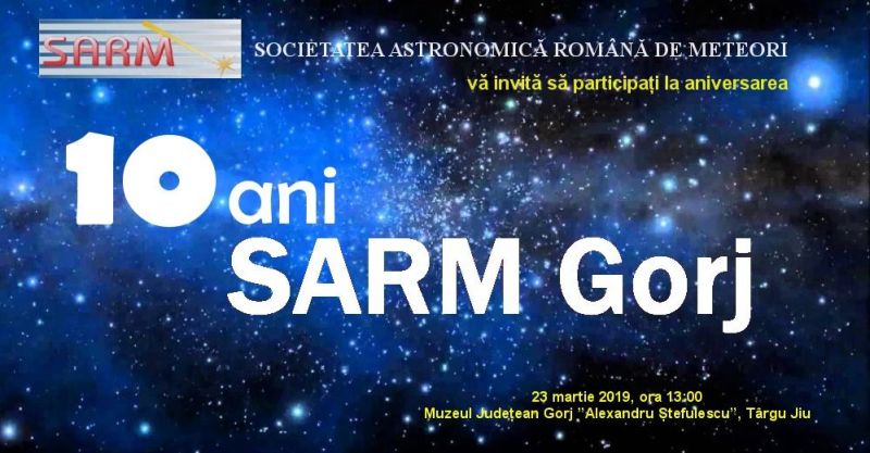Astroclubul SARM Gorj, filială a Societății Astronomice Române de Meteori (SARM), aniversează zece ani de existenţă. Cu această ocazie, oameni de toate vârstele sunt aşteptaţi pe 23 martie, începând cu ora 13.00, la Muzeul Județean Gorj ,,Alexandru Ștefulescu” din Târgu-Jiu. După terminarea evenimentului, dacă cerul este senin organizatorii promit o sesiune de observații astronomice. Intrarea este liberă, iar coordonatorii promit o serie de expoziţii, dar şi invitaţi de renume din ţară. ,,Zece ani, plini de realizări și totodată, trăirea a numeroase evenimente și experiențe deosebite înconjurat de oameni minunați. Am legat multe prietenii, și nu în ultimul rând, am împărtășit frumusețile cerului înstelat. Și pentru că noi, iubitorii cerului vom sărbători ,,10 ani SARM Gorj”, dorim să ne fiți alături așa cum o faceți mereu. De aceea, vă invităm sâmbătă, 23 martie 2019, începând cu ora 13.00 la Muzeul Județean Gorj ,,Alexandru Ștefulescu” din Târgu-Jiu, ca să petreceți câteva ore memorabile alături de oameni speciali… Invitații noștri la acest eveniment sunt: Valentin Grigore – Președinte Societatea Astronomică Română de Meteori; Prof. Elisabeta Ana Naghi – consilier superior Ministerul Educației Naționale; Dr. Liliana Afrodita Boldea – Universitatea din Craiova, Dolj; Institutul de Fizică și Inginerie Nucleară, Măgurele; Cosmin Sorin Miclos – Președinte Asociația Ucenicul Astronom; Prof. Adina Oancea – Colegiul Național ”Octavian Goga”, Sibiu; Virgiliu Pop – Cercetător științific la Agenția Spațială Română, Timișoara; Andrei Juravle – Vp. Societatea Română Pentru Astronomie Culturală, Timișoara; Ștefan Chostache – Președinte Asociația Astronom Experience Constanța; Cristian Danescu – Cercetător la Observatorul București al Institutului Astronomic al Academiei Române; Mircea Pteancu – Astroclub Galaxis, Arad; Prof. Nicoleta Pazmany – Președinte Astroclub Meridian 0, Oradea; Prof. Liliana Manciu Guran – Universitatea de Vest ”Vasile Goldiș”, Arad; Andrei Dorian Gheorghe – Vp. Societatea Astronomică Română de Meteori; Andrei Răzvan – Facultatea de Geologie și Geofizică, Universitatea București, Gorj”, anunţă organizatorii evenimentului. În cadrul evenimentului vor avea loc şi o serie de expoziţii, şi anume: Expoziție de meteoriți – prezentare Răzvan Andrei, Expoziție de astrofotografii și astropictură, autori Marian și Ramona Achim, Expoziție cu vânzare de instrumente astronomice (Magazinul Telescop-Expert) și literatură de astronomie pentru amatori (autori Marcel Jinca și Aurelia Idita).