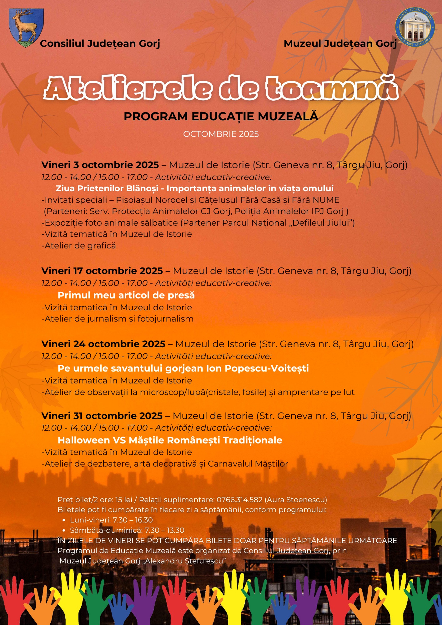 Activitățile se vor desfășura în fiecare vineri din luna octombrie 2025, la Muzeul de Istorie din Târgu Jiu (Str. Geneva nr. 8), în două serii orare: 12:00–14:00 și 15:00–17:00.