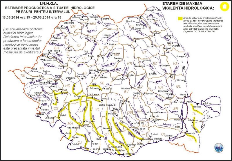 “În intervalul 18.06.2014, ora 23:00 – 20.06.2014, ora 18:00 pe râurile din bazinele hidrografice: Timiş superior, Cerna (judeţul Caraş-Severin), Drincea (judeţul Mehedinţi), afluenţii Mureşului din judeţul Hunedoara, Jiu superior şi afluenţii săi din judeţele Hunedoara, Gorj, Mehedinţi şi Dolj, Desnăţui (judeţul Dolj), afluenţii Oltului mijlociu şi inferior (judeţele Sibiu, Vâlcea, Gorj şi Olt), Călmăţui, Vedea (judeţele Olt, Argeş şi Teleorman), afluenţii Argeşului inferior din judeţele Argeş, Dâmboviţa, Giurgiu şi Ilfov) şi pe râurile mici din Dobrogea (judeţele Constanţa şi Tulcea). Se impune urmărirea evoluţiei situaţiei hidrometeorologice, în conformitate cu Regulamentul privind gestionarea situaţiilor de urgenţă generate de inundaţii, fenomene meteorologice periculoase, accidente la construcţii hidrotehnice, poluări accidentale pe cursurile de apă şi poluări marine în zona costieră”, se arată în informarea ABA Jiu.