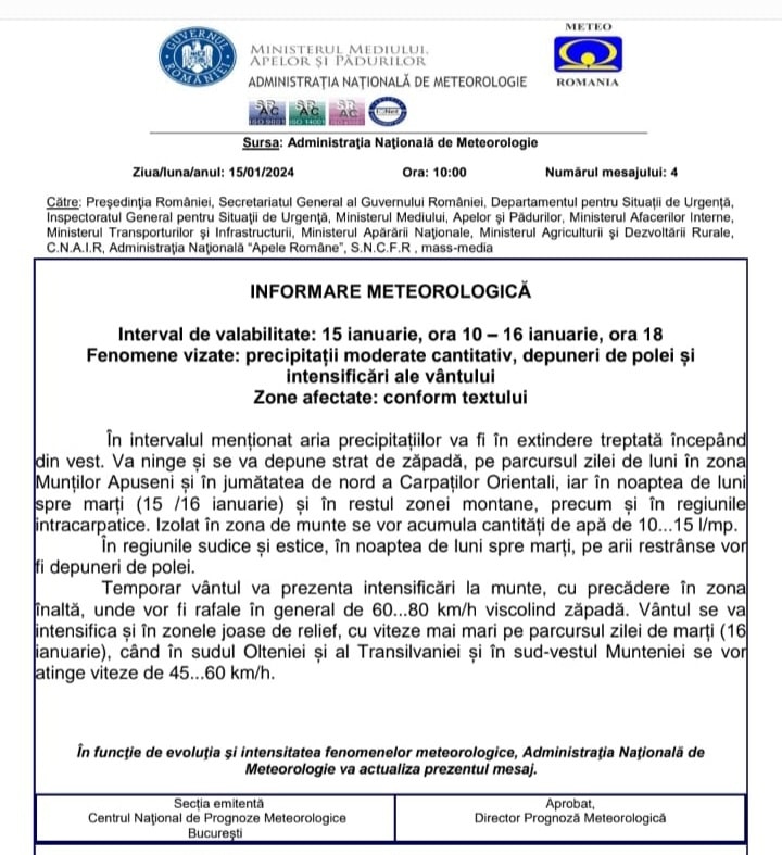 ”ANM a emis o atenționare de depunere a poleiului pentru perioada 15-16.01.2024, în special în timpul nopții.