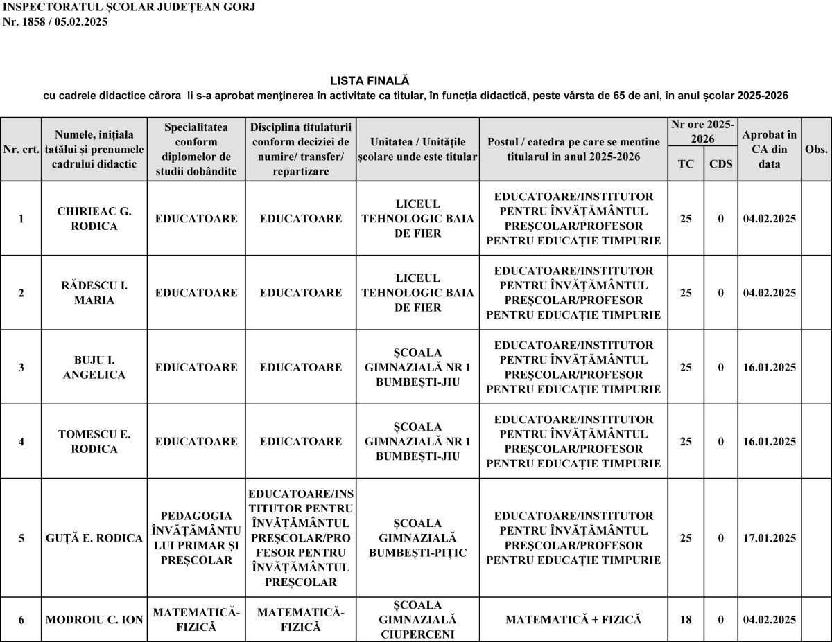 Cererea de menținere în activitate este analizată în cadrul consiliilor de administrație ale școlilor, iar ulterior în Consiliul de Administrație al Inspectoratului Școlar Județean Gorj. Astfel, în anul școlar 2025-2026, în școlile din județ vor preda 54 de dascăli pensionabili, dintre care o parte au beneficiat de prelungirea activității, iar alții solicită pentru prima dată menținerea în sistemul de învățământ.