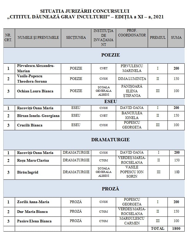 Ediția 2021 a Concursului ”Cititul dăunează grav inculturii” a fost lansată în luna martie a acestui an, elevii de gimnaziu și liceu având termen până pe 10 mai pentru a-și trimite lucrările. Competiția a avut patru secțiuni: ”Poezie”, ”Eseu”, ”Dramaturgie” și ”Proză”. La prima secțiune au fost acordate următoarele premii: Premiul I – Pîrvulescu Alexandru-Marian, Colegiul Național ”Ecaterina Teodoroiu” Târgu-Jiu (prof. coordonator Pîrvulescu Marinela), Premiul II – Vasile-Popescu Theodora-Sorana, Colegiul Național ”Spiru Haret” Târgu-Jiu (prof. coordonator Dima Luminița) și Premiul III – Ochian Laura Bianca, Școala Gimnazială Albeni (prof. coordonator Pânișoară Elena Ștefania). La secțiunea ”Eseu” au fost premiați: Racoviță Oana Maria, Colegiul Național ”Spiru Haret” Târgu-Jiu (prof. coordonator David Oana) – Premiul I, Bîrsan Ionela-Georgiana, Colegiul Național ”Ecaterina Teodoroiu” Târgu-Jiu (prof. coordonator Banciulea Ionela) – Premiul II și Crucilă Bianca, Colegiul Național ”Spiru Haret” Târgu-Jiu (prof. coordonator Popescu Georgeta) – Premiul III. La secțiunea ”Dramaturgie”, au fost acordate următoarele premii: Premiul I – Racoviță Oana Maria, Colegiul Național ”Spiru Haret” Târgu-Jiu (prof. coordonator David Oana), Premiul II – Roșu Mara Clara, Colegiul Tehnic ”G-ral Gheorghe Magheru (prof. coordonator Verdeș Maria-Rocselana), Premiul III – Birău Ingrid, Școala Gimnazială Albeni (prof. coordonator Vasile Popescu Ion Sorin). La cea de-a patra și ultima secțiune a concursului, secțiunea ”Proză”, au fost premiați: Zorilă Anna-Maria, Colegiul Național ”Spiru Haret” Târgu-Jiu (prof. coordonator Popescu Georgeta) – Premiul I, Dur Maria Bianca, Colegiul Tehnic ”G-ral Gheorghe Magheru (prof. coordonator Verdeș Maria-Rocselana) – Premiul II și Pasăre Elena Bianca, Colegiul Tehnic ”G-ral Gheorghe Magheru (prof. coordonator Mărgulescu Carmen) – Premiul III.