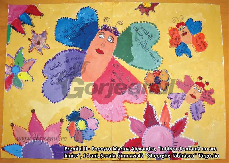 Premiul I a fost adjudecat de Mirea Oana-Gabriela (15 ani), din satul Vlăduleni, comuna Bîlteni, cu lucrarea “Dragoste de mamă”. Premiul II a revenit elevei Popescu Marina Alexandra (14 ani), de la Școala Gimnazială “Gheorghe Tătărăscu” Târgu-Jiu, pentru lucrarea “Iubirea de mamă nu are limite”, iar Premiul III a fost acordat elevei Dragomir Alexandra Maria (8 ani), de la Școala Primară Crasna Deal, pentru lucrarea “Mama mea – bucuria vieții mele!”. De asemenea, s-a mai decis acordarea unui Premiu Special, constând în publicarea lucrării pe prima pagină a cotidianului “Gorjeanul”, elevei Dogaru Alexandra (9 ani), de la Școala Gimnazială “Prof. Nicolae Caranda” Glogova. Reamintim că, potrivit regulamentului, evaluarea lucrărilor s-a făcut ținându-se cont de următoarele criterii: originalitate, claritatea mesajului transmis, încadrarea în specificul concursului, respectarea convențiilor de realizare a unui desen, aspectul estetic și stilistic, precum și unitatea compoziției.