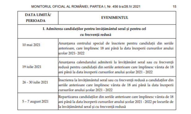 Pe 26 iulie s-a dat startul înscrierilor la învățământul seral și cel cu frecvență redusă. Potrivit calendarului admiterii, candidații din seriile anterioare care împlinesc 18 ani până la începutul anului școlar viitor se pot înscrie până pe 30 iulie, urmând ca repartizarea candidaților pe locurile disponibile să se facă luna viitoare.
