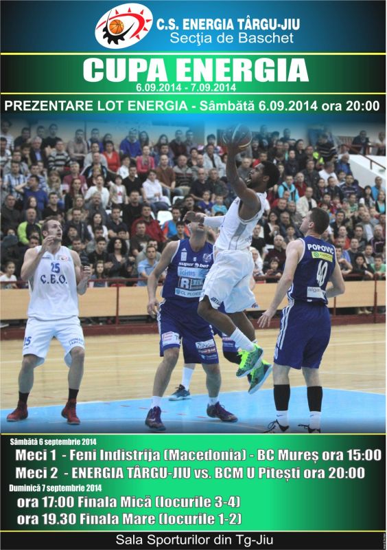 În acest week-end, baschet-baliștii Energiei vor evolua pentru prima dată și în fața propriilor suporteri. Cupa Energia se va disputa în perioada 6-7 septembrie în Sala Sporturilor din Târgu Jiu, cu prezența a două echipe de top din România, BC Mureș (locul 3 în ultima ediție de campionat), și BCM U Pitești, și una din străinătate, Feni Indistrija, din Macedonia.