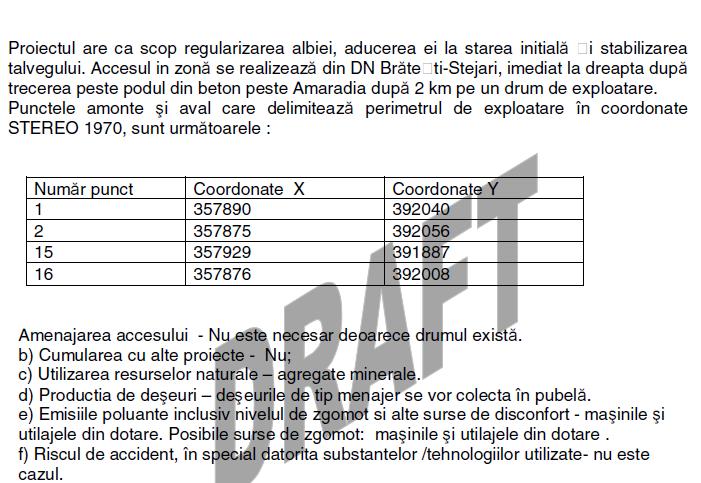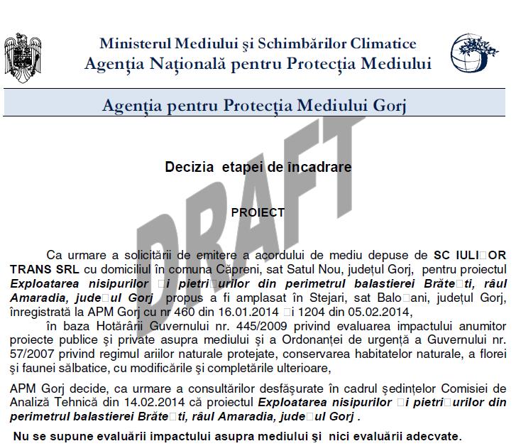 De altfel, în primăvara anului trecut, Iulişor Trans solicita de la Agenţia pentru Protecţia Mediului Gorj un aviz de mediu pentru proiectul intitulat: “Exploatarea nisipurilor şi pietrişurilor din perimetrul balastierei Brăteşti, râul Amaradia, judeıul Gorj propus a fi amplasat în Stejari, sat Baloşani”. Proiectul care are ca scop şi “regularizarea albiei râului Amaradia, aducerea ei la starea iniţială şi stabilizarea talvegului”, nu îşi produce însă efectele, reclamă proprietarii de terenuri afectaţi din Brăteşti.
