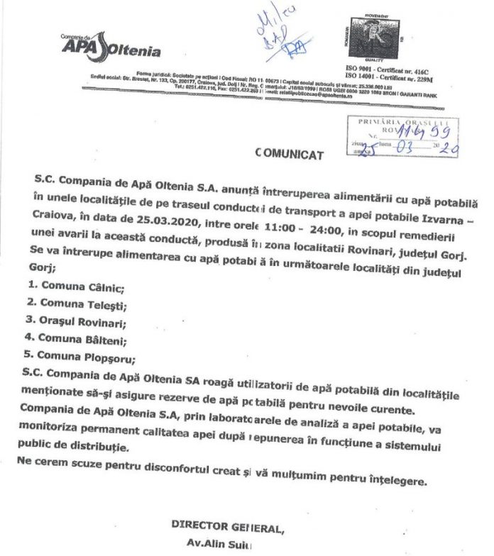 Astfel, SC Compania de Apă Oltenia și-a anunțat utilizatorii direct interesați de acest lucru, încă din data de 24 martie, conform anunțului publicat pe site-ul companiei: ,,S.C. Compania de Apă Oltenia S.A. anunță întreruperea alimentării cu apă potabilă în unele localități de pe traseul conductei de transport a apei potabile Izvarna – Craiova, în data de 25 martie 2020, între orele 11.00 – 24.00, în scopul remedierii unei avarii la această conductă, produsă în zona localității Rovinari, județul Gorj.Se va întrerupe alimentarea cu apă potabilă în următoarele localități din județul Gorj: comuna Câlnic; comuna Teleşti; oraşul Rovinari; comuna Bâlteni; comuna Plopşoru. Compania de Apă Oltenia S.A, prin laboratoarele de analiză a apei potabile, va monitoriza permanent calitatea apei după repunerea în funcțiune a sistemului public de distribuție. Ne cerem scuze pentru disconfortul creat și vă mulțumim pentru înțelegere”.