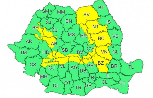 În intervalul menționat, în cea mai mare parte a zonei montane, local în Moldova și pe arii restrânse în nordul Munteniei vor fi averse, descărcări electrice, intensificări de scurtă durată ale vântului și izolat grindină.