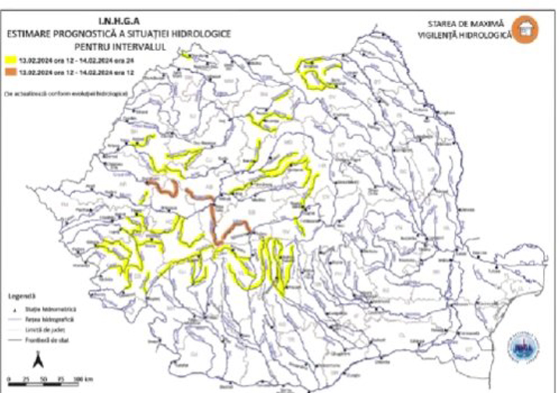 Totodată, în intervalul 13.02.2024 ora 12:00 – 14.02.2024 ora 24:00, este activ Codul galben, pe anumite sectoare de râuri din bazinele hidrografice: Tur (sector îndiguit, judeţul Satu Mare), Someşul Mare (judeţul Bistriţa Năsăud), Someşul Mic (judeţele: Bihor şi Cluj), Crişul Negru (judeţele: Bihor şi Arad), Crişul Alb (judeţele: Hunedoara şi Arad), Mureş (judeţele: Mureş, Bistriţa Năsăud, Alba, Sibiu, Hunedoara şi Arad), Arieş (judeţele: Alba şi Cluj), Târnava Mică (judeţele: Harghita, Mureş şi Alba), Târnava Mare (judeţele: Harghita, Mureş, Braşov, Sibiu şi Alba), Bega (judeţul Timiş), Timiş (judeţele: Caraş Severin şi Timiş), Caraş, Nera (judeţul Caraş Severin), Cerna (judeţele: Gorj şi Caraş Severin), Jiu (judeţele: Hunedoara şi Gorj), Olt (judeţele: Braşov, Harghita, Sibiu, Vâlcea şi Argeş), Argeş (judeţul Argeş), Suceava (judeţul Suceava) și Moldova (judeţul Suceava).