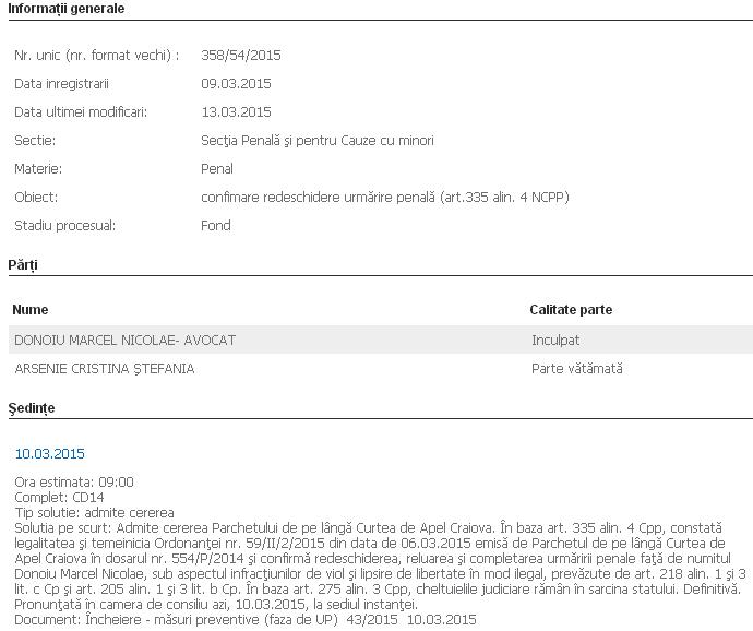 La cererea părţilor, instanţa Curţii de Apel pronunţă, luna trecută, sentinţa, definitivă, în Camera de Consiliu astfel: “Admite cererea Parchetului de pe lângă Curtea de Apel Craiova. În baza art. 335 alin. 4 Cpp, constată legalitatea şi temeinicia Ordonanţei nr. 59/II/2/2015 din data de 06.03.2015 emisă de Parchetul de pe lângă Curtea de Apel Craiova în dosarul nr. 554/P/2014 şi confirmă redeschiderea, reluarea şi completarea urmăririi penale faţă de numitul Donoiu Marcel Nicolae, sub aspectul infracţiunilor de viol şi lipsire de libertate în mod ilegal, prevăzute de art. 218 alin. 1 şi 3 lit. c Cp şi art. 205 alin. 1 şi 3 lit. b Cp. În baza art. 275 alin. 3 Cpp, cheltuielile judiciare rămân în sarcina statului”.
