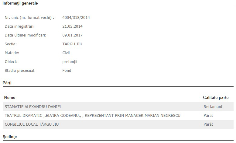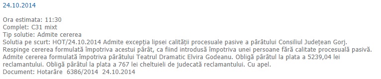 Teatrul a fost însă atât de bine reprezentat de avocata aleasă de Marian Negrescu, încât instituția a pierdut procesul ce i-a fost intentat pe pretenții, atât pe fond, la Judecătoria Târgu-Jiu, cât și în apel. Instanța a admis astfel, în octombrie 2014, cererea formulată împotriva pârâtului Teatrul Dramatic “Elvira Godeanu” și a obligat pârâtul (teatrul) la plata a 5.239,04 lei reclamantului Alexandru Daniel Stamatie. Astfel, teatrul, cu tot cu avocat plătit din bani publici, a mai fost obligat să-i mai achite reclamantului și 767 de lei taxe judiciare și alți 400 de lei, cheltuielile respectivului din apel. Avocată în acest proces a fost Camelia Băluțoiu, se arată în raportul Camerei de Conturi Gorj după controlul de la Teatrul Dramatic “Elvira Godeanu”, respectiva fiind cu ani în urmă fost recuziter al instituției de cultură și pentru o perioadă chiar actriță la structura aflată acum în subordinea Primăriei Târgu-Jiu.