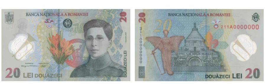 Banca Naţională a României (BNR) pune în circulaţie de miercuri, 1 decembrie 2021, o bancnotă cu valoarea nominală de 20 lei, fiind prima bancnotă cu putere circulatorie pe care este prezentă o personalitate feminină: Ecaterina Teodoroiu.