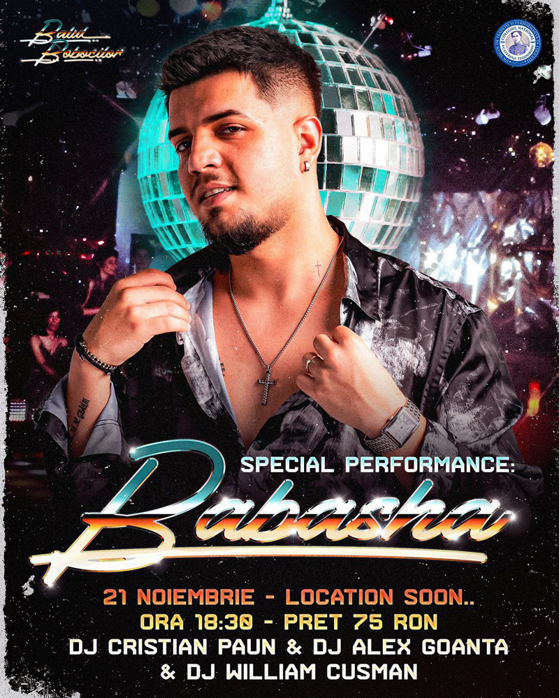 Unul dintre cei mai apreciați artiști din peisajul muzical actual, Babasha, va ridica atmosfera la cote maxime. Cu un stil unic și energie debordantă, Babasha promite un spectacol care va face din Balul Bobocilor 2024 un eveniment memorabil. Publicul va fi purtat într-o călătorie muzicală electrizantă, plină de vibe-uri pozitive.