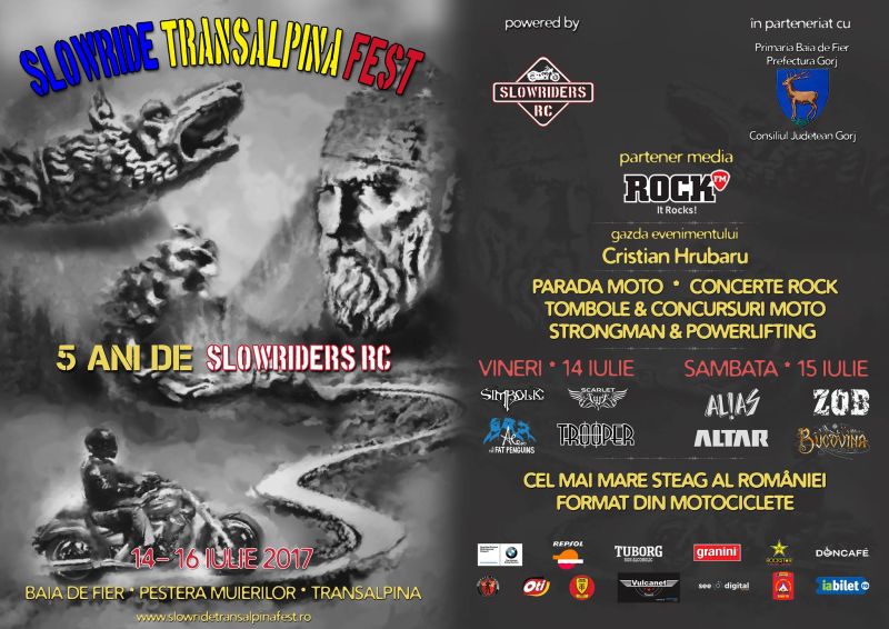 Pe Transalpina, locul de joacă al motocicliștilor, organizatorii Slowride Transalpina Fest vor să adune toți prietenii din lumea moto și rock și să sărbătorească așa cum știu ei, cu multă bere rece și mâncăruri gustoase. „Stand de tatuaje, articole și accesorii din piele, echipamente și multe produse moto, alături de concursurile și parada moto sunt câteva din atracțiile acestei aniversări. Etapa națională de STRONGMAN și POWER LIFTING va completa evenimentul, alături de concertele pe care vi le-am pregătit. Vor fi alături de noi BUCOVINA, ALTAR, TROOPER, ZOB, ALEX & THE FAT PENGUINS și SCARLET AURA. Iar pentru a marca cum se cuvine acest eveniment, SlowRiders RC vă propune să formăm împreună cel mai mare tricolor din motociclete!”, susțin organizatorii festivalului.