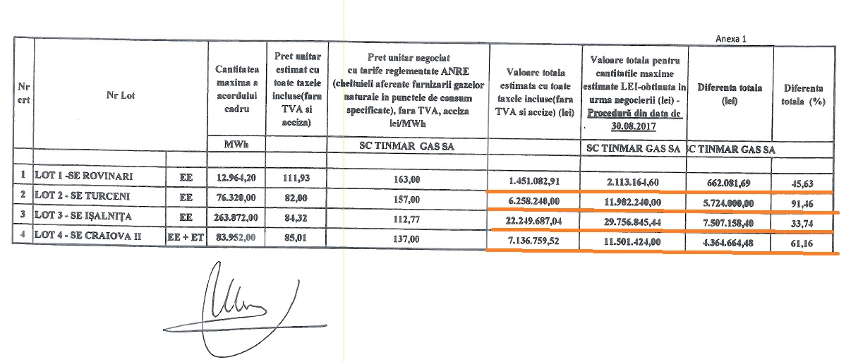 ”Ținând cont de importanța deosebită a gazului natural în funcționarea grupurilor energetice – continuarea activității”, așa cum se menționează într-un document al companiei prin care a fost informată AGA cu privire la procedura de atribuire, CEO a fost nevoită să încheie contracte cu Tinmar Gas SA pentru cele patru loturi la prețuri uriașe: 163 lei/MWh la SE Rovinari, adică 2.113.164 lei, cu peste 662.000 de lei peste valoarea estimată; 157 lei/MWh la SE Turceni, valoarea contractului fiind de 11.982.240 de lei, cu 5.724.000 de lei peste valoarea estimată, adică cu peste 91%; la SE Işalniţa prețul de achiziție a fost de 112,77 lei/MWh, valoarea contractului de 29.756.845 de lei, fiind mai mare cu 7.504.000 peste cea estimată de companie şi, în fine, pentru SE Craiova, prețul a fost de 137 lei/MWh, contractul fiind de 11.501.000 lei, adică cu peste 4.300.000 de lei mai mare decât estimase CEO.