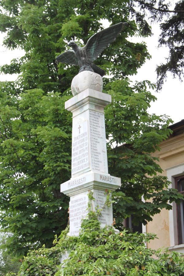 În formă de obelisc, monumentul are în vârf vulturul carpatin cu crucea în cioc şi aripile larg deschise privind spre zări, emblemă a vitejiei ostăşeşti pentru apărarea fiinţei neamului românesc şi veşniciei României. Confecţionat din bronz, vulturul are înfipte ghearele într-o sferă tot din marmură albă, pe care este sculptată harta României Mari.