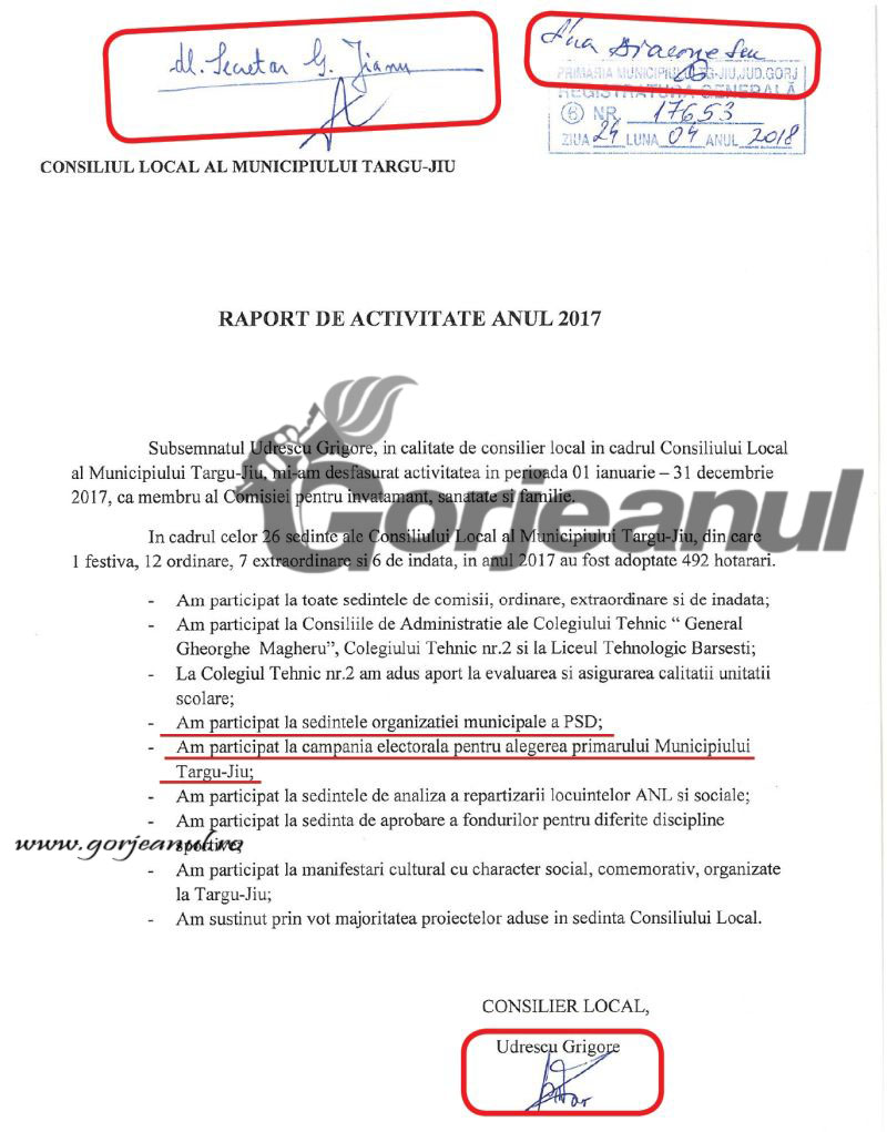 Potrivit Legii administrației publice locale și a Statutului aleșilor publici locali, ”fiecare consilier local, precum și viceprimarul sunt obligați să prezinte un raport anual de activitate, care va fi făcut public prin grija secretarului”. Pe 24 aprilie a.c., consilierul local PSD Grigore Udrescu și-a depus raportul de activitate aferent anului precedent, documentul fiind semnat de juristul consiliului local, Loredana Deaconescu și de secretarul municipiului Târgu-Jiu, Grigore Jianu. Medic de profesie, Udrescu și-a descris activitatea de consilier local pe anul 2017 în nouă fraze, adică pe trei sferturi de pagină, în care a menționat ședințele și manifestările la care a participat și că a votat majoritatea proiectelor. De remarcat este faptul că alesul local a inclus în raport și activitatea sa politică, susținând că a participat ”la ședințele organizației municipale a PSD” și ”la campania electorală pentru alegerea primarului Municipiului Târgu-Jiu”. Cu alte cuvinte, Udrescu a încasat indemnizația de 700 de lei, din bugetul public al orașului, pentru activitatea în slujba partidului. Legislația menționată stabilește că, fiecare consilier local primește o indemnizație pentru participarea la ședințele consiliului local și ale comisiilor de specialitate, și nu pentru alte activități, cu atât mai puțin pentru cele politice.