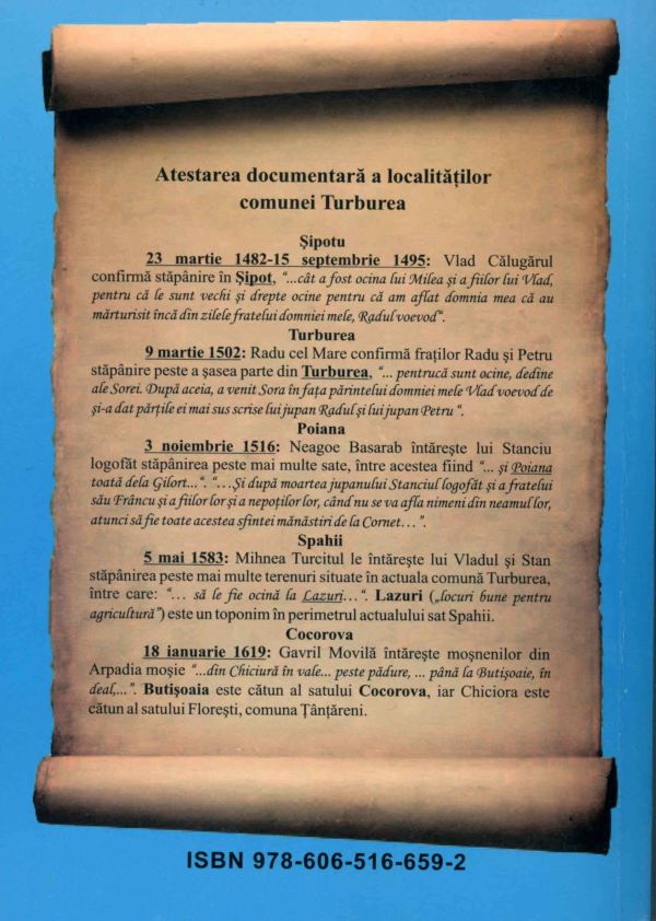 Deşi despre monografia lui Nelu Vasile, “Turburea-Gorj, vatră multiseculară de civilizaţie românească”, la momentul apariţiei (Târgu-Jiu, Editura Măiastra, 2014), s-au întrecut două condeie vesele în cotidianul Gorjeanul-prof. Virgil Cercelaru şi distinsul jurnalist Ion Predoşanu. Cu modestele mele posibilităţi încerc a readuce în atenţia publică unele informaţii în legătură cu monumentul de cultură de la Turburea, judeţul Gorj. Masiva lucrare conţine mai multe monografii într-una, întrucât comuna Turburea este formată după 1968 din mai multe comune şi, la fiecare capitol sau subcapitol, autorul a adăugat la Turburea şi aspecte importante referitoare, de exemplu, la Şipotu, Poiana, Spahii, Cocorova. După menţionarea unei lgende în legătură cu geneza şi denumirea localităţii Turburea urmează o predoslovie în care se menţionează actele culturale premergătoare acestei întreprinderi realizate de Neva, apoi structura propriu-zisă a lucrării: Cadrul natural sau pământul străbunilor, Cadrul istoric, Cadrul administrativ, Cadrul socio-demografic, Cadrul economic şi Cadrul spiritual, încheindu-se cu Comuna azi şi în perspectivă la care se adaugă o bogată bibliografie. Referitor la spaţiul geografic al localităţii, autorul menţioneză aşezarea, drmurile de acces, relieful colinar, clima şi hidrografia, flora şi fauna, solul şi resursele solului, apoi o vastă toponimie sau nume de locuri din Turburea şi celelalte sate-foste comune- (oiconime sau nume de sate şi cătune, denumiri ale denivelărilor de teren, reţeaua hidronimică, toponime-puncte de reper, toponime care păstrează amintirea unor fapte, obiecte sau evenimente istorice importante şi altele. Informaţiile care privesc problemele de istorie a localităţilor care formează comuna Turburea sunt aproape exhaustive, începând cu primii locuitori, descoperirile arheologice şi multe vestigii importante depuse în punctele muzeale ale şcolilor din Turburea şi Şipotu, documente istorice privind atestarea documentară şi alte documente referitoare la Turburea, Şipotu, Spahii, Poiana, Cocorova…
