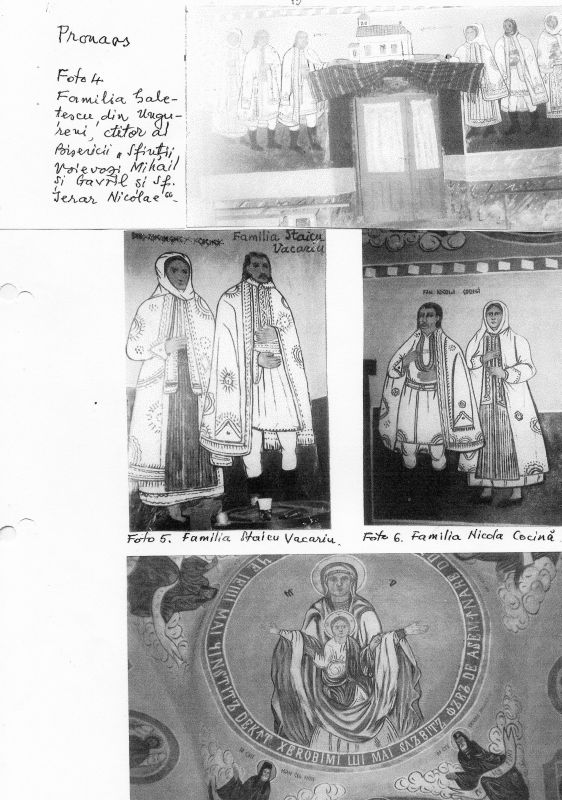 Familia Galeţescu, pe peretele de la intrare (din vest), de-o parte şi de alta a uşii, ţine în mână macheta bisericii (Foto 4), în dreapta (sud) familia Staicu Vacariu (Foto 5) şi pe peretele din stânga (nord) familia Nicola Cocină (Foto 6), îmbrăcate în veşminte de epocă: bărbaţii pieptare şi cojoace deasupra, pe cap cârpe şi în picioare pantofi.