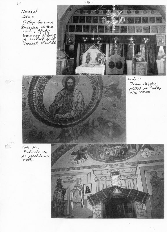 La intrarea în naos te întâmpină, în faţă, catapeteasma (Foto 8), care are deasupra uşilor de la intrarea în altar trei rânduri de icoane: în primul rând, de sus, sunt proorocii; în al doilea rând sunt cei 12 apostoli cu Iisus Hristos, în mijloc şi în al treilea rând cele douăsprezece praznice împărăteşti care se dau la cununia tinerilor familii.