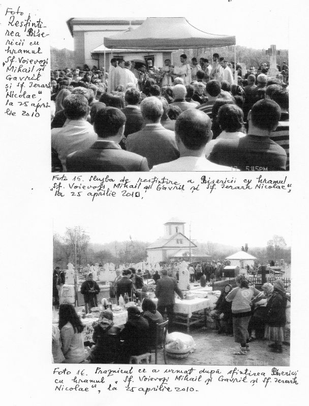 „În urma acestor lucrări a fost resfinţită în ziua de 25 aprilie 2010 de către Înalt Prea Sfinţitul Dr. Irineu Arhiepiscop al Craiovei şi Mitropolit al Olteniei Protoiereu al protoieriei Tg. Jiu Nord, fiind P.C. Preot Vlădoiu Vasile, iar paroh fiind preotul Popescu Vasile Gheorghe, înconjuraţi de un ales sobor de preoţi şi diaconi.”(Actul de resfinţire) Foto 15,16.