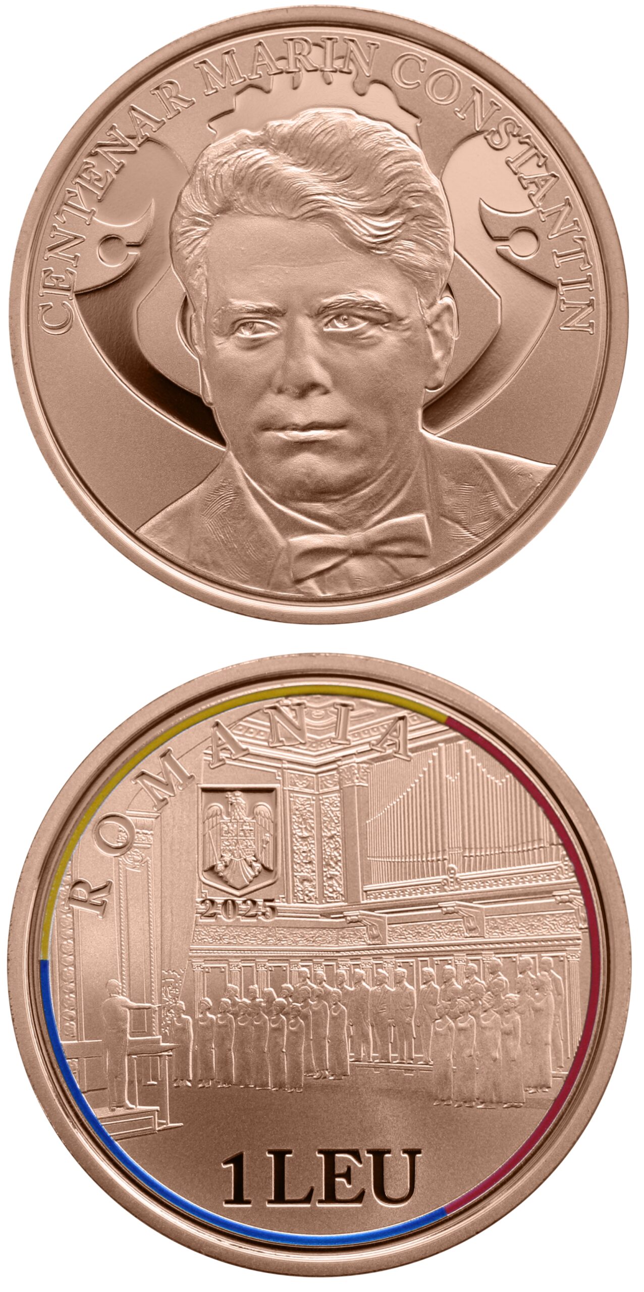 – Reversul înfățișează pe Marin Constantin dirijând Corul Madrigal, alături de stema României, inscripția „ROMÂNIA”, anul „2025” și valoarea nominală „1 LEU”;