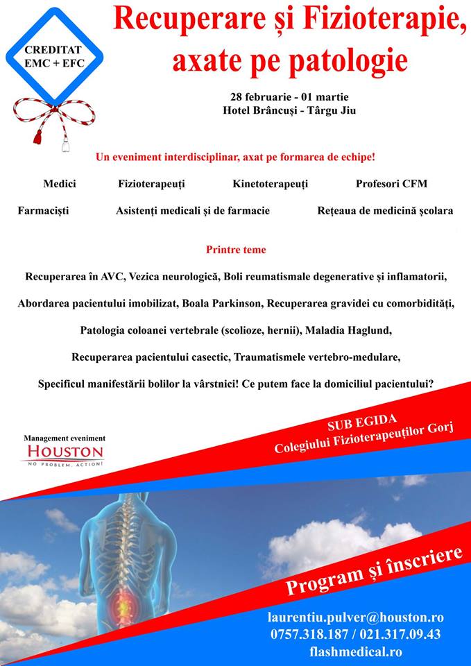 Evenimentul, inițiat și dezvoltat sub egida Colegiului Fizioterapeuților Gorj, în parteneriat cu Colegiul Fizioterapeuților din România, Universitatea ”Constantin Brâncuși” din Târgu-Jiu, Asociația de Medicină Funcțională, Societatea Română de Gerontologie și Geriatrie și Colegiul Medicilor Gorj, are ca și coordonatori științifici pe dr. Oana Luciana Băleanu, medic de recuperare medicală și pe conf. univ. dr. Tiberiu Tătaru, președinte al Colegiului Fizioterapeuților Gorj. Boala Parkinson, un subiect care nu putea lipsi de la un eveniment pentru care se ocupă de logistica houstonicii! Tema-dezbatere va fi axată pe un studiu observaţional care a urmărit eficacitatea tandemului neurolog-fizioterapeut în creşterea calităţii vieţii persoanelor cu această patologie. În ce a constat programul de reabilitare ambulatorie şi care au fost rezultatele lui, care a fost impactul asupra scorurilor pentru anxietate şi depresie vor afla cei care vor fi prezenţi în sala de conferinţe a hotelului „Brâncuşi”, în Târgu-Jiu, la Conferinţa „Recuperare şi Fizioterapie, axate pe patologie” în ultima zi a lunii februarie şi în ziua de Mărţişor (28 februarie- 1 martie) de la dr. Elena Mihaela Pungan şi kinetoterapeut Loredana Negrea!  Conferința „Recuperare și fizioterapie, axate pe patologie” se bucură de prezența unor lectori de renume: prof. univ. Monica Delia Bîcă, Ktp Dumitru Dănuț Bădulescu, Dr. Ana Băleanu, Dr. Ioana Luciana Băleanu, Prof. CFM Pr Elena Căciulan, Asist. med. Lucian Cârstoiu, Conf. univ. dr. Delia Cinteză, Dr. Sebastian Diaconescu, Ktp Marius Donici, Dr. Cristina Dorojan, Ktp Daniela Ene, Ktp Lucian Galoși, Dr. Sebastian Grădinaru, Dr. Andrei Manu-Marin, Farmacist Valentin Nănescu, Dr. Bogdan Niculescu, Dr. Nida-Alexandra Cojan-Cârlea, Dr. Carmen Palinkaș, Dr. Daniela Poenaru, Dr. Alin Popescu, Prof. dr. Gabriel Ioan Prada, Dr. Mihaela Elena Pungan, Dr. Monica Radu, Șef lucr. dr. Bogdan Socea, Kinetoterapeut Daniela Stanca, Dr. Adrian Victor Tetileanu. Taxele de înscriere sunt reduse inclusiv astăzi, 5 februarie. Pentru informații suplimentare legate de înscriere, cei interesați pot trimite email-uri pe adresa laurentiu.pulver@houston.ro, sau pot apela numărul: 0733.076.38! Obiectivele evenimentului sunt facilitarea lucrului în echipă și managementul integrat al pacientului, actualizarea informațiilor legate de ceea ce înseamnă fizioterapie și care sunt obiectivele Colegiului Fizioterapeuților și, nu în ultimul rând, dezvoltarea colaborării cu instituțiile de stat, cum ar fi Casa de Pensii, Comisia de Evaluare Persoane cu Handicap, Casa de Asigurări de Sănătate, Direcția de Sănătate Publică, etc. Conferința se adresează cadrelor medicale și fizioterapeuților interesați de actualizarea cunoștințelor medicale în ceea ce privește bolile reumatismale degenerative și inflamatorii, bolile neurologice (focus pe Boala Parkinson), patologia coloanei vertebrale (cu accent pe scolioză), osteoporoză, abordarea pacientului casectic, recuperarea pacientului imobilizat, vezica neurologică/incontinența urinară, activitatea fizică a gravidei și alte teme de interes mai ales din perspectiva globală a abordării prevenției și a pregătirii pentru îmbătrânirea populației.