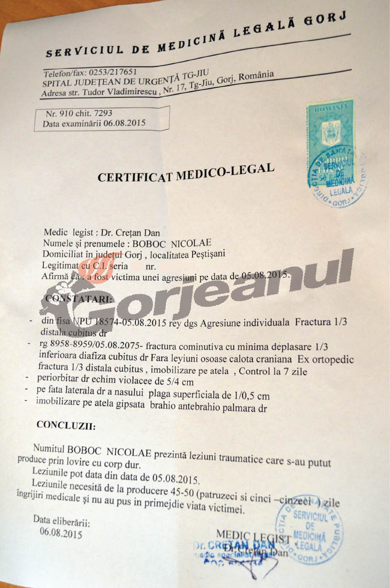 spital la Târgu-Jiu. Până la venirea poliţiştilor, Dumitrache a luat cele două lopeţi cu care m-a lovit el şi ceilalţi din echipa sa şi le-a aruncat într-o fântână aflată pe proprietatea mea. Ţin să precizez că mă aşteptam la reacţii violente, cu o zi înainte de incident anunţând chiar la postul de poliţie Peştişani că s-ar putea întâmpla ceva urât, ştiind caracterul lui Dumitrache din rândul trecut. Am şi depus o plângere, marţi, la Poliţia Peştişani prin care anunţam că respectivul mi-a tăiat abuziv şase butuci de vie şi mi-a sustras de pe terenul meu cinci stâlpi, de fier şi lemn, care susţineau via. Poliţiştii mi-au zis să stau liniştit că astfel de lucruri nu trebuie să se întâmple. A doua zi am ajuns însă l-a spital cu mâna fracturată, dar şi cu o plagă în zona nasului şi el fracturat”, spune Nicolae Boboc.
