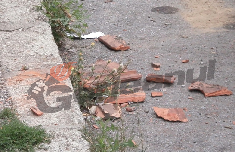 Lăsând gluma la o parte, ţiglele ce formau la ora construcţiei o serie de elemente de ornament specifice acelor tipuri de blocuri lăsate fără întreţinere ori executarea lucrărilor de consolidare ani de zile, constituie astăzi după cum se poate vedea şi la baza blocului (unde nu întâmplător la parter sunt spaţii comerciale ce sunt frecventate de clienţi) veritabile proiectile ce la o intensificare de vânt ori aversă pot cauza răni deloc neglijabile celor ce au ghinionul de a fi pe trotuarul de la baza blocului în momentul nepotrivit.
