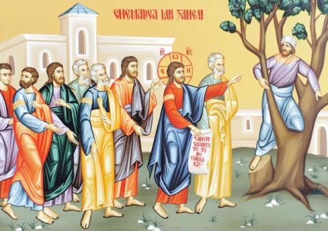Aşadar, în Duminica a 32-a după Rusalii, ne aflăm cu mintea şi cu sufletul în Ierihon, unul dintre oraşele preferate ale Mântuitorului, pentru că multe întâmplări, multe minuni, multe drumuri ale Lui Iisus Hristos Mântuitorul sunt legate de el, un orăşel situat aproape de graniţa cu Iordania de astăzi şi care beneficiază de o poziţie în acelaşi timp privilegiată şi blestemată, şi este blestemată, pentru că se află la câteva sute de metri sub nivelul mării, astfel încât, coborând de la Ierusalim spre Ierihon, întotdeauna ţi se pare că intri dintr-o dată într-un cuptor încins, foarte cald, mai ales că în acelaşi timp, se ştie că pe lângă oraş trece Iordanul cu apă dulce, care izvoreşte de la poalele muntelui Hermon, trece prin Marea Galileii şi se varsă în Marea Moartă, o mare cu apă sărată. Mai are Ierihonul, în partea de nord, un izvor de apă rece, cu apă bună de băut, care reconfortează pe tot călătorul care trece până acolo, iar, la sud este pustia Quarantaniei. Iată, aşadar, o serie de amănunte care fac din Ierihon un loc interesant, iar, Mântuitorul va fi avut în mod sigur şi alte motive personale de a-l prefera, fiind posibil ca uneori să fi venit din Galileia, în jos pe Iordan, de unde urca la Ierusalim. Ca urmare, după vindecarea orbului, e de presupus că oamenii vorbeau între ei, comentau, mulţi voiau să se atingă de Iisus, mulţi voiau să-I pună întrebări şi era mare zarvă cu o mare mulţime. În Ierihon, mai locuia un oarecare Zaheu, de profesiune vameş, adică, agent fiscal, unul care încasa dările pe pământuri, pe case, pe produse, pe circulaţia mărfurilor, acesta însemnând personajul Pericopei Evanghelice a Duminicii a 32-a după Rusalii. Deci, Zaheu era mic de statură şi văzând că vin mulţimile cu Iisus în frunte, îşi dă seama că voia să-L vadă. Pentru aceasta, s-a urcat într-un sicomor, iar, până în zilele noastre, li se arată pelerinilor şi astăzi sicomorul ca o mărturie materială a autenticităţii întâmplării, mărturie care a străbătut prin timp până la noi de peste două mii de ani. Iată, aflăm că Zaheu, urcat în sicomor, a vrut să-L vadă pe Iisus mai bine, pentru că în felul acesta, l-a văut şi Mântuitorul pe dânsul, aşa cum ne relatează Sf. Ev. Luca: «Şi intrând, trecea prin Ierihon. Şi iată un bărbat, cu numele Zaheu şi acesta era mai-marele vameşilor şi era bogat. Şi căuta să vadă cine este Iisus, dar nu putea de mulţime, pentru că era mic de statură. Şi alergând el înainte, s-a suit într-un sicomor, ca să-L vadă, căci pe acolo avea să treacă. Şi când a sosit la locul acela, Iisus, privind în sus, a zis către el: ,,Zahee, coboară-te degrabă, căci astăzi în casa ta trebuie să rămân”! Şi a coborât în grabă şi L-a primit, bucurându-se. Şi văzând, toţi murmurau, zicând că a intrat să găzduiască la un păcătos. Iar Zaheu, stând, a zis către Domnul: Iată jumătate din avera mea, Doamne, o dau săracilor şi dacă am năpăstuit pe cineva cu ceva, întorc împătrit. Şi a zis către Iisus: ,,Astăzi s-a făcut mântuire casei acesteia, căci şi acesta este fiu al lui Avraam. Căci Fiul Omului a venit să caute şi să mântuiască pe cel piedut”! (Luca 19, 1-10). Aşadar, mergând în casa lui Zaheu, s-a întâmplat ceea ce va fi fost foarte firesc: mulţimile au început să murmure şi să întrebe, cum de intră Acesta în casa unui păcătos, fiindcă vameşii erau prototipul, simbolul păcătoşeniei şi al lăcomiei! Posibil ca vameşul Zaheu să fi fost foarte cunoscut în oraş, fiindcă îndeplinea funcţia de mai-mare al vameşilor, un fel de perceptor şef, care negocia cu stăpânii romani suma pe care trebuie s-o strângă, iar, pentru aceasta, îşi angaja vameşi subalterni pe care îi plătea şi după ce făceau suma cerută de romani, restul şi-l împărţeau între ei, partea leului revenindu-i bineînţeles şefului Zaheu! De obicei, în lumea veche, aceşti oamei nu erau simpatizaţi de popor, erau consideraţi chiar odioşi. Nu existau pe atunci forme, declaraţii exacte de bunuri, în măsura în care sunt astăzi, putându-se calcula exact impozitele pe care trebuie să le plătească fiecare la stat, ceea ce le dădea prilejul acestor funcţionari să fie adesea abuzivi, când stabileau după bunul lor plac, spre a le rămâne şi lor cât mai mult! Ar trebui să mai spunem că se găsesc şi în ziua de azi din aceia care spun că Iisus a fost un oarecare rabin obscur şi neînsemnat, Care nu ar putea să creeze o religie, să cucerească o lume, să umple lumea cu cărţi despre El şi cu imense catedrale, să umple lumea cu martiri pentru El, mărturisind cu preţul vieţii lor că a fost Dumnezeu. E bine să înţelegem şi să desluşim chiar modul strălucit cum a reuşit Domnul să-i ducă pe credincioşii Săi până la sacrificiul suprem în numele Lui, chiar şi printr-o întâmplare cum a fost aceasta cu Zaheu, din care putem afla şi alte lucruri decât ceea ce ne spune ea în mod direct! Pentru aceasta, Evanghelistul Luca a vrut să ne spună ceea ce s-a întâmplat cu Zaheu şi cum s-a întâlnit el cu Mântuitorul şi cum Mântuitorul a acceptat să vorbească cu el şi chiar a dorit să intre în casa lui, fiindcă acesta a fost gândul evanghelistului în chip cu totul secundar când a relatat şi faptul că Mântuitorul mergea înconjurat de mulţimi. Tocmai acest amănunt ne descoperă că Mântuitorul era o personalitate mare în epocă, foarte cunoscut, pentru că altfel, de ce l-ar fi urmat mulţimile, de ce s-ar vorbi despre mulţimile din jurul Său? Şi nu e singurul loc unde se vorbeşte despre mulţimi, deoarece, pe când şedea Iisus la masă, au venit o mulţime de vameşi şi păcătoşi la El (Matei 9, 10; Luca 5, 29), sau, după El a mers o mare mulţime de oameni din Iudeea (Marcu 3, 7), sau, toată mulţimea, cupri