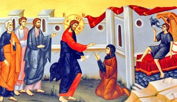 Aşadar, în Duminica a 17-a după Rusalii, avem Evanghelia cu femeia cananeeancă ce venise la Iisus şi Îl ruga să-i tămăduiască fiica cea cuprinsă de duhul cel necurat, însă, Domnul respinge de trei ori rugămintea ei, spunând că e trimis numai către oile cele pierdute ale casei lui Israel, iar, pentru o femeie păgână, nu se cade a se lua pâinea fiilor şi a se arunca înaintea câinilor. Dar, femeia s-a rugat insistent, zicând: «Adevărat, Doamne, că şi câinii mănâncă din sfărâmiturile ce cad din masa domnilor». Dar, atunci Iisus i-a zis: „O, femeie, mare este credinţa ta, fie ţie cum voieşti!”, pentru că femeia din Evanghelia de duminică este pusă înaintea noastră cu o învăţătură despre modul cum trebuie să fie credinţa noastră, în situaţia în care cananeanca era o femeie păgână ce trăia într-o ţară păgână, adusă înaintea Lui Iisus pentru necazul şi chiar credinţa ei tare că numai singur Iisus o poate ajuta. Aşa trebuie să fie, iubiţi cititori, şi credinţa noastră, să avem o credinţă vie şi lucrătoare, care să ne aducă în faţa Mântuitorului cu toate necazurile şi bolile noastre sufleteşti, pentru că o credinţă ce te lasă ca să stai liniştit în bolile cele sufleteşti este o credinţă moartă. Dar, femeia din Evanghelie ne este de învăţătură nu numai prin modul cum a plecat ca să-L afle pe Hristos, ci şi prin modul cum s-a purtat în faţa Mântuitorului, pentru că Domnul, «întâi nu i-a răspuns ei cuvânt», cum spune Evanghelia, mai ales că o altă femeie, mai slabă de credinţă, după acest refuz, poate că s-ar fi depărtat, dar, cananeanca n-a disperat, a intervenit prin apostoli, însă şi pe calea aceasta i-a venit un refuz categoric: „Spuneţi acestei femei, a zis Iisus ucenicilor Săi, că Eu sunt trimis numai pentru oile cele pierdute ale casei lui Israel; femeia aceasta nu face parte din turma oilor Mele!”. Dar, femeia, nici după acest refuz nu disperă şi se adresează din nou Mântuitorului, prin cuvintele: «Doamne, ajută-mi!», ştiindu-se faptul că evreii erau poporul cel ales, prin care Dumnezeu hotărâse ca să vină mântuirea în lume. Dar, din alegerea aceasta, evreii îşi făcuseră un titlu de mândrie, deoarece, pe toate celelalte popoare le numeau «câini de dispreţuit», iar, Mântuitorul fiind pe punctul acesta de vedere, îi spune femeii: „Nu este bine a lua pâinea fiilor (adică a fiilor lui Israel) şi a o arunca câinilor (adică păgânilor)”, considerându-se că în sfârşit, acest răspuns categoric o va depărta pe femeie. Dar, credinţa ei nu slăbeşte, ci, dimpotrivă, se face şi mai fierbinte şi mai stăruitoare, când cade iar la picioarele Mântuitorului, cu vorbele: «Da, Doamne, dar şi câinii mănâncă din fărâmiturile care cad de la masa stăpânilor lor», pentru ca noi să înţelegem şi mai bine că femeia aceasta prestase un strălucit examen de credinţă. În final, Iisus Hristos îi spune: ,,O, femeie, mare este credinţa ta; fie ţie după cum voieşti”, iar fiica ei s-a vindecat! Aşa trebuie să fie şi credinţa noastră: tare, statornică, stăruitoare, dar, sunt atâţia oameni care cred numai până ce le merge bine, însă, credinţa lor slăbeşte îndată ce le vine un necaz sau o încercare, deoarece credinţa trebuie apoi să fie împreunată cu smerenia şi cu recunoaşterea păcatelor. Credinţa cea adevărată trebuie să ne aplece şi pe noi la picioarele Domnului Iisus Hristos, la picioarele Crucii Sale! Dar, este ceva ce ne deosebeşte de femeia din Evanghelie, care era o femeie păgână şi cerşea ca o păgână, o fărâmă din masa Domnului Iisus, pe când noi, ştim că suntem fiii Lui, pe care El Însuşi ne cheamă la masă, spre deosebire de femeia cananeancă ce umbla după Mântuitorul cerşind o fărâmă din darurile Lui! După noi umblă Mântuitorul, rugându-ne şi îmbiindu-ne să luăm şi să gustăm din darurile mântuirii ce ni le-a câştigat pe crucea Golgotei, dar, nu pentru păcate îşi pierd oamenii sufletul, ci pentru că nu vor să ia mântuirea ce li se oferă cu atâta bunătate de către Domnul Iisus Hristos! Oamenii care nu au frică de Dumnezeu sunt în stare să facă orice rău, nu se ţin de cuvânt şi fac la păcate mari şi grele cu multă uşurinţă. Cum să nu îngăduie Dumnezeu pe satana ca să intre în aceşti nelegiuiţi? Sunt o mulţime de oameni lacomi şi nedrepţi care înşeală, mint, fură şi trăiesc din astfel de nedreptăţi şi asupriri, iar, păcatele acestea grozave se vor întoarce asupra lor şi îi vor chinui nu numai în veşnicie, dar chiar şi aici, în viaţa aceasta, aşa că, să nu li se pară că au înşelat pe cineva, ci s-au înşelat pe ei înşişi,pentru că întotdeauna, Dumnezeu luminează pe cei neştiutori şi îi întăreşte pe cei slabi, le dă înţelepciune celor smeriţi, iar celor mulţi le dă grai, când revarsă din belşug mulţimea binefacerilor Sale!