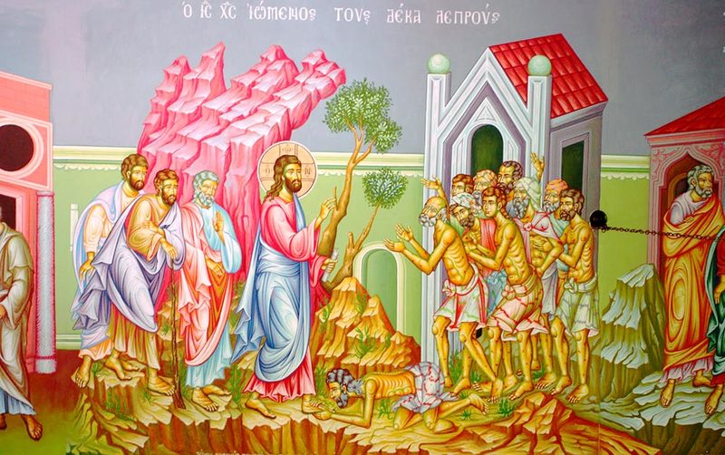 În Duminica a 29-a după Rusalii; Ap. Duminicii a 28-a ; Coloseni: 1, 12-18; Ev. Luca 17, 12-19 (a celor 10 leproşi; glas 6, voscr 9, în cadrul Sfintei Liturghii oficiate în Biserica Ortodoxă Română, la Sfânta Evanghelie se va citi un text mai surt, dar extrem de bogat în profunzimea sa, prin care se arată că în timp ce Mântuitorul se îndrepta spre Ierusalim, străbătând satele şi oraşele din Galileea şi Samaria, însoţit de ucenici, în preajma unui sat, numit după tradiţie Eugannim, Domnul este întâmpinat de zece bărbaţi leproşi, care, ridicându-şi braţele pline de răni spre Fiul Lui Dumnezeu Tatăl, strigau plini de durere: «Iisuse, Învăţătorule, miluieşte-ne» (Luca 17, 13), cu precizarea că suferinţa celor zece oameni era neînchipuit de mare, fiindcă erau bolnavi de cea mai îngrozitoare formă a suferinţei omeneşti, de lepră, iar, microbul leprei infectează pielea bolnavului şi acoperă tot corpul de răni purulente, după care descompune ţesuturile, macină vasele, desfigurează chipul până la epuizarea totală şi până la moarte. Fiind vorba despre o boală molipsitoare, cele mai aspre măsuri s-au luat încă din vechime pentru întâmpinarea şi înlăturarea ei, pentru că şi legea lui Moise poruncea ca leproşii să fie îndepărtaţi şi izolaţi de orice aşezare omenească (Numeri 5, 1-3). Aşadar, cei bolnavi de lepră erau izolaţi de restul familiei şi de membrii comunităţii pentru a fi trimişi în locuri pustii, nelocuite, unde erau obligaţi ca la apropierea întâmplătoare a unei persoane, să strige: «Necuraţi, necuraţi!», fiind consideraţi nişte oameni morţi între vii. O asemenea etichetare o aveau şi cei zece bărbaţi leproşi amintiţi de Sfânta Evanghelie, însă, auzind ei de minunile şi de marea iubire de oameni a Domnului Iisus Hristos, o sfântă fărâmă de nădejde le aprinde inima când află că Fiul lui Dumnezeu trece prin acele locuri şi atunci au alergat cu înfrigurare spre Domnul Dumnezeu şi au strigat de la distanţă cu toată puterea sufletului lor, aşa cum am precizat: «Iisuse, Învăţătorule, miluieşte-ne!». Evanghelia ne mai spune că nouă dintre cei leproşi erau iudei, iar unul era samarinean, iar, suferinţa îi unise în nădejde şi într-o rugăciune caldă, plină de umilinţă şi de credinţă! La strigătul cutremurător şi disperat al leproşilor, Domnul Iisus Hristos Se opreşte, ascultă şi-i priveşte cu dumnezeiască îndurare şi fără să rostească vreun cuvânt sau să facă vreun gest, ca în atâtea alte cazuri de suferinţă omenească, ci numai prin simpla Sa Voinţă dumnezeiască, Mântuitorul Hristos îi tămăduieşte pe loc de cumplita boală, spunându-le: „Duceţi-vă şi vă arătaţi preoţilor” (Luca 17, 14), iar, ca la o poruncă atotbiruitoare, durerile dispar, rănile se închid şi nici o urmă de lepră nu mai rămâne. Cei vindecaţi, cuprinşi de negrăită bucurie a unor oameni care înviază din morţi, aleargă spre preoţi ca să capete aprobarea că s-au vindecat de lepră, că pot intra fericiţi în sânul familiilor lor. Însă, dintre cei zece, nouă au plecat fără să arate un semn de recunoştinţă Celui Care i-a vindecat, uitând să mulţumească măcar cu un cuvânt dumnezeiescului Tămăduitor. Singur samarineanul, omul străin şi pe jumătate păgân, se opreşte în culmea bucuriei, se reculege şi cu inima pătrunsă de cea mai sfântă recunoştinţă, se întoarce la Cerescul Doctor al sufletelor şi al trupurilor, mulţumindu-i cu umilinţă din adâncul sufletului, «slăvindu-L pe Dumnezeu cu glas mare şi căzând cu faţa la picioarele Lui» (Luca 17, 15-16). Prin această pildă, Dumnezeu ne arată că datoria noastră este aceea de a fi recunoscători prin faptă bună în orice împrejurare a vieţii şi prin cuvântul de mulţumire faţă de binefăcătorii noştri!