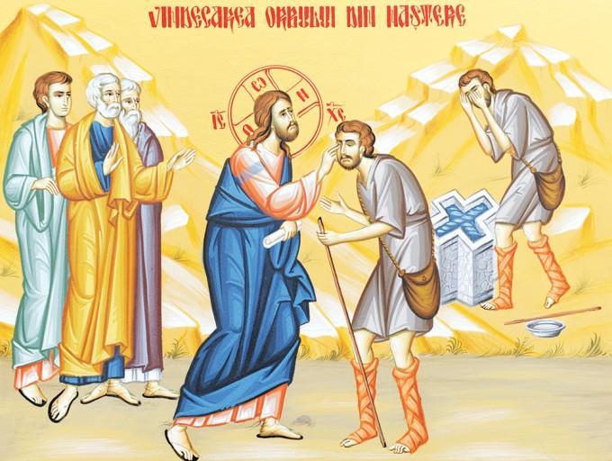 În Duminica a 6-a după Sfintele Paşti (Vindecarea orbului din naştere); Ap. Fapte 16, 16-34; Ev. Ioan 9, 1-38, la Sfânta şi Dumnezeiasca Liturghie, din Sfânta Evanghelie rânduită a se citi, aflăm că prin minunea vindecării trupești și sufletești a orbului din naștere, Mântuitorul Iisus Hristos, Doctorul înțelept și grijuliu, vrea să-i vindece pe cei cu mintea orbită, prin mijlocirea unui orb la trup, care nu orbise de vreo boală, ci aşa se născuse, iar modul prin care Mântuitorul nostru Iisus Hristos face acest lucru vedem că depășește orice logică și argumentare omenească! Neîndoielnic, ştiința medicinei se ocupă doar cu acele maladii care apar pe parcursul vieţii în organism, dar neocupându-se cu vindecarea unei probleme din naștere, ba, mai mult chiar, nici cu toate bolile care apar după naștere! Desigur, Dumnezeu nu L-ar fi osândit pe acel orb din pricina păcatelor părinților lui, căci nu-l pedepsește pe un om în locul altuia, aşa cum nici pentru păcatele lui nu a fost pedepsit, căci se născuse orb, știind că nimeni nu păcătuiește înainte de naștere, pentru că e greu să ne imaginăm lumea unui orb care nu a văzut niciodată, care vede pentru prima oară şi care, după ce vede, în fiecare clipă, va scoate o exclamaţie de uimire în faţa a ceea ce zăreşte, chiar în faţa lucrurilor banale, cu care noi ne-am obişnuit mereu! Orbul din naştere, care şi-a căpătat vederea la o oarecare maturitate, este singurul în stare să vadă lumea ca o minune a Lui Dumnezeu. Ce poate fi, oare, mai banal decât un răsărit de lună, ca fenomen cosmic? Există, poate, chiar un ceasornic al universului după care, la o anumită oră şi într-un anumit moment, răsare soarele sau luna! Fenomen mecanic, zicem noi, dar, Doamne, câtă frumuseţe, câtă poezie, câtă adâncime şi câtă dumnezeire poate fi într-un răsărit de lună! Şi câtă minune poate fi în omul care îl contemplă, pentru că numai omul se poate uimi în faţa unui răsărit de lună şi numai un poet sau un muzician, care sunt oameni, pot să-l cânte cu glasul sufletului, pentru că Dumnezeu vrea ca prin smerita cugetare, să ne ferească de întunecimea necredinţei, de orbirea sufletească a îndoielii şi să ne învrednicească a dobândi vederea duhovnicească!