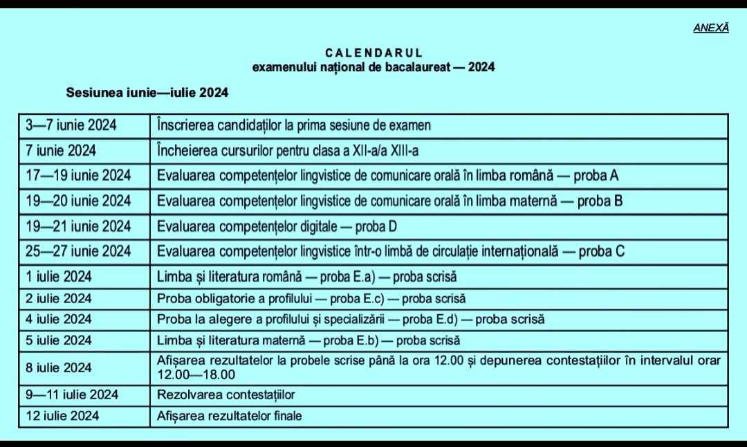 Calendarul examenului de Bacalaureat 2024 a fost publicat în Monitorul Oficial aseară. Probele scrise debutează la începutul lunii iulie, iar pe 7 iunie este ultima zi de cursuri pentru elevii care sunt anul acesta în clasa a XII-a sau a XIII-a. Înscrierea pentru sesiunea de vară se face în perioada 3 – 7 iunie 2024. În perioada 17-27 iunie 2024 are loc evaluarea competențelor, iar probele scrise se desfășoară între 1 și 5 iulie. Afișarea primelor rezultate va avea loc pe 8 iulie.