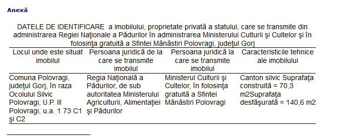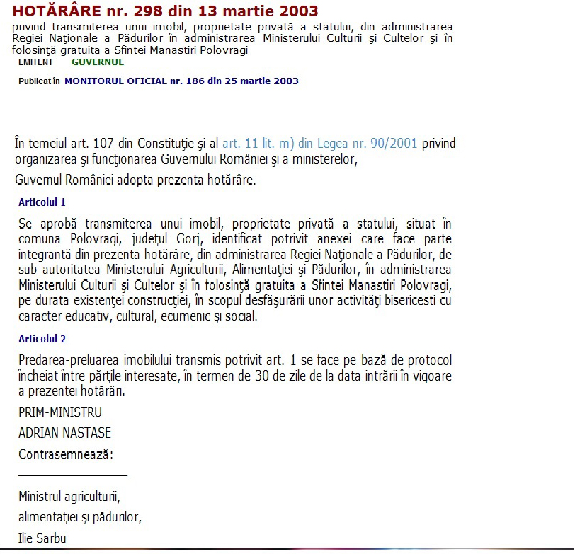 Şi astfel, deoarece clădirea era în curtea lăcaşului, transferarea spaţiului în proprietatea Mănăstirii Polovragi a constituit doar un act juridic, şi o procedură birocratică care trebuie îndeplinită. Nu trebuie uitat însă că, măicuţele au primit spaţiul la care au râvnit de 11 ani, doar după ce Adrian Năstase şi Ilie Sârbu au spus, în 2003, pentru prima dată “Da”. Mai exact, reamintim că, prin Hotărârea de Guvern nr. 298, din 13 martie 2003, Mănăstirea Polovragi a primit de la Stat dreptul de folosinţă gratuită asupra cantonului silvic al Ocolului Polovragi. Hotărârea “privind transmiterea unui imobil, proprietate privată a statului, din administrarea Regiei Naţionale a Pădurilor în administrarea Ministerului Culturii şi Cultelor şi în folosinţă gratuită a Sfintei Mănăstiri Polovragi”, emisă de Guvernul României cu 11 ani în urmă, este publicată în Monitorul Oficial NR. 186 din 25 martie 2003. “Se aprobă transmiterea unui imobil, proprietate privată a statului, situat în comuna Polovragi, judeţul Gorj, identificat potrivit anexei care face parte integrantă din prezenta hotărâre, din administrarea Regiei Naţionale a Pădurilor, de sub autoritatea Ministerului Agriculturii, Alimentaţiei şi Pădurilor, în administrarea Ministerului Culturii şi Cultelor şi în folosinţă gratuită a Sfintei Mănăstiri Polovragi, pe durata existenţei construcţiei, în scopul desfăşurării unor activităţi bisericeşti cu caracter educativ, cultural, ecumenic şi social”, se arată în primul articol al acestei hotărâri. “Predarea-preluarea imobilului transmis potrivit art. 1 se face pe bază de protocol încheiat între părţile interesate, în termen de 30 de zile de la data intrării în vigoare a prezentei hotărâri”, se mai arată în documentul semnat de premierul de atunci, Adrian Năstase, de Ministrul Pădurilor, Adrian Sărbu, de Ministrul administraţiei publice, Octav Cozmancă şi de Ministrul finanţelor publice, Mihai Nicolae Tănăsescu.