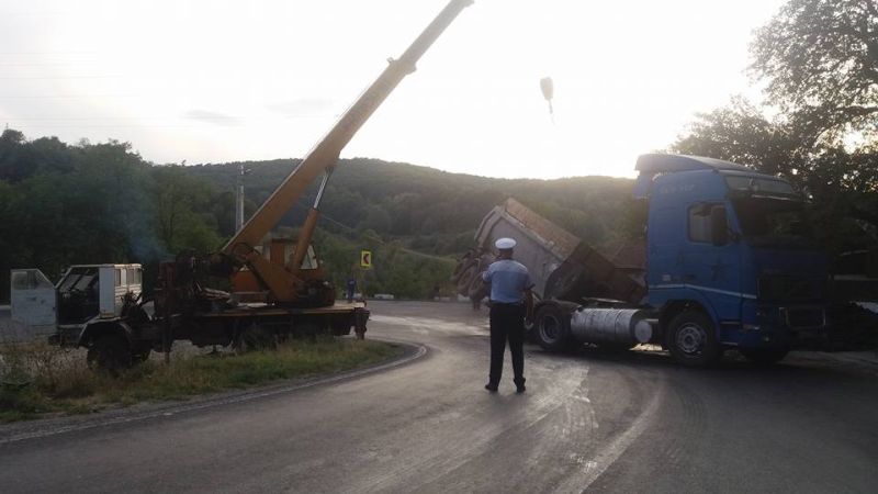 Mai exact, un camion care transporta cărbune s-a răsturnat pe carosabil, totul datorându-se exploziei unui cauciuc al mașinii.