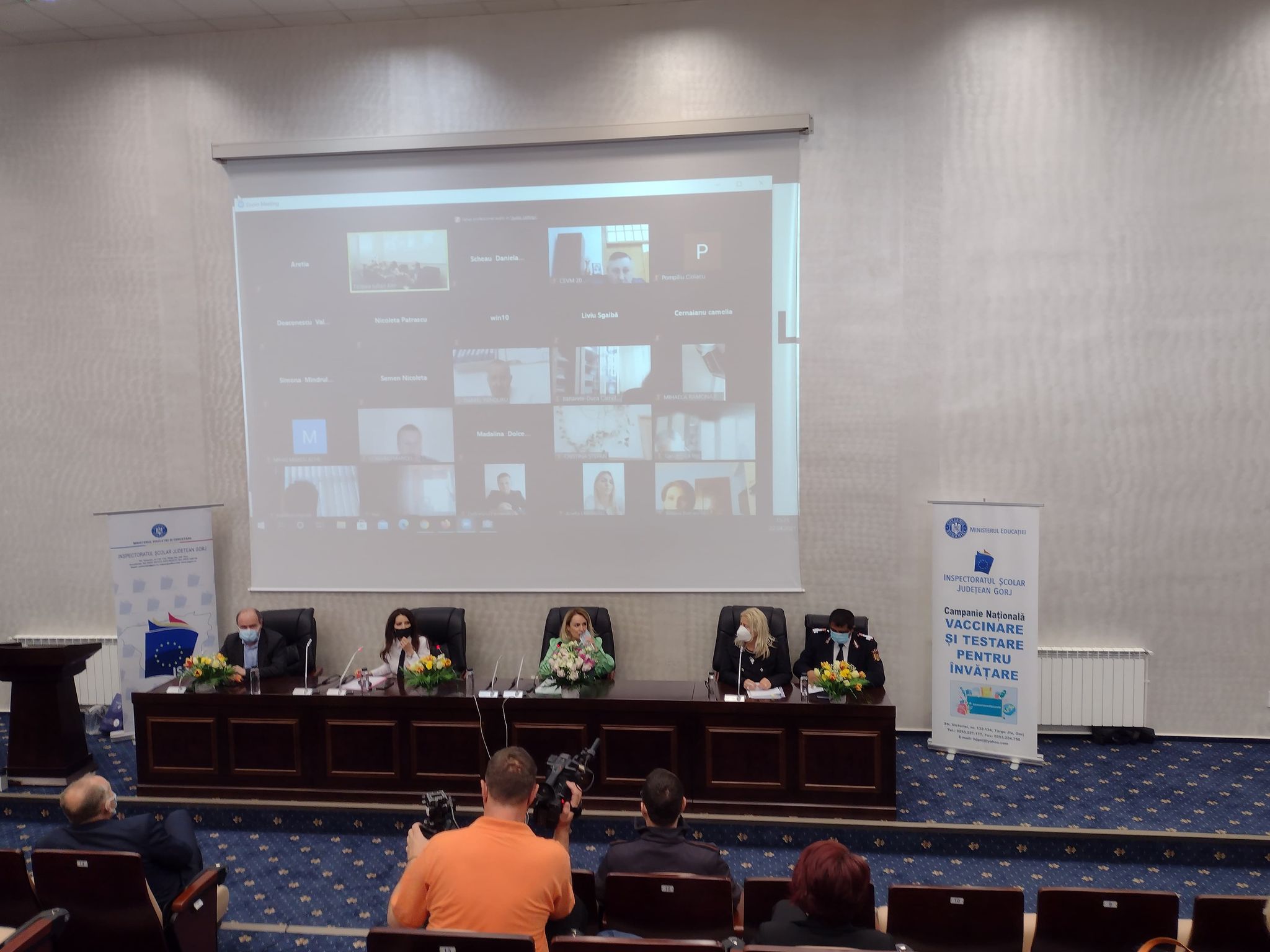 Campania ”Vaccinare și testare pentru învățare” a fost lansată de Ministerul Educației la începutul acestei luni, din dorința de a-i încuraja pe cei care încă au temeri vizavi de vaccinare. ”Motivul pentru care cei cinci secretari de stat din Ministerul Educației merg în județele din România este acela de a promova campania ”Vaccinare și testare pentru învățare”, o campanie pe care Ministerul Educației a gândit-o în sprijinul Ministerului Sănătății și o campanie care se încadrează într-o ramă mare, generoasă, pe care Guvernul României o desfășoară la acest moment cu privire la importanța vaccinării și a testării. (…)Nu sunt eu profesionistul care să aibă pretenția de a face recomandări profesorilor, părinților și elevilor cu privire la vaccinare și nici la testare. Acesta este motivul pentru care Ministerul Educației a solicitat în teritoriu prezența medicilor specialiști care să răspundă întrebărilor profesorilor, părinților și elevilor. (…) Tragem un semnal cu privire la faptul că ne dorim reîntoarcerea la școală, acesta este motivul pentru care facem acest tur de țară, ne dorim reîntoarcerea la școală și suntem conștienți că este posibilă atâta vreme cât procentul de vaccinare va fi unul îmbucurător. Nu suntem aici pentru a impune obligația cadrelor didactice de a se vaccina. În comunicatul acestei campanii naționale, subliniam că educația este cea care te ajută să te protejezi, respectând regulile. (…) Școala te ajută să te protejezi, dacă știi să respecți regulile, dar școala trebuie să fie și cea care să te formeze pentru a avea opinii consolidate, să-ți dezvolte gândirea critică, gândirea selectivă. Noi avem un adversar extrem de puternic astăzi, fake news și false news, și împotriva acestui adversar trebuie să luptăm, mai ales noi, cei din educație, cu toate armele de care dispunem”, a declarat Ștefania Marina Manea la începutul întâlnirii. ”Ne bucurăm că putem să găzduim acest eveniment extrem de important pentru toată țara, nu numai pentru noi. (…) Având în vedere că această campanie este extrem de popularizată și este extrem de bine venită, aș vrea să spun doar faptul că, atât timp cât ne considerăm oameni educați, atât timp cât lucrăm în acest domeniu, atâta timp cât, din fericire, această pandemie a venit peste noi în secolul 21, când beneficiem de tehnică, când beneficiem de o evoluție foarte rapidă în medicină, când beneficiem de oameni extrem de doritori să participe la încetarea acestei situații de fapt și revenirea la normalitate, ar trebui să trăim cu o speranță permanentă pentru revenirea la viața noastră dinainte. (…) Nu ne-am lăsat niciunii învinși și facem tot ce ține de noi să o depășim”, a declarat și Dana Constantinescu, inspectorul școlar general al Inspectoratului Școlar Județean Gorj. Pe lângă motivele pentru care este necesară vaccinarea, s-a discutat și despre testele aplicate în unitățile de învățământ, despre motivele reticenței părinților cu privire la aplicarea acestor teste, dar și posibilitatea înlocuirii acestora cu unele non-invazive. De asemenea, a fost abordat subiectul extinderii acestei campanii de promovare a vaccinării și testării, fiind avansată, de exemplu, posibilitatea organizării unor întâlniri online între elevi, părinți, profesori și specialiști din cadrul DSP Gorj. Alte subiecte abordate au fost programul ”Școală după școală”, cuantumul burselor școlare și proiecte sistemice ale Ministerului Educației referitoare la formarea cadrelor didactice.