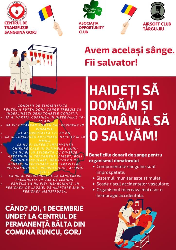 Centrul de permanență medicală Bâlta din comuna Runcu va găzdui în data de 1 Decembrie 2022, o campanie națională de donare de sânge, organizată de televiziunea de știri Digi 24 și Centrul de Transfuzie Sanguină din Târgu-Jiu.