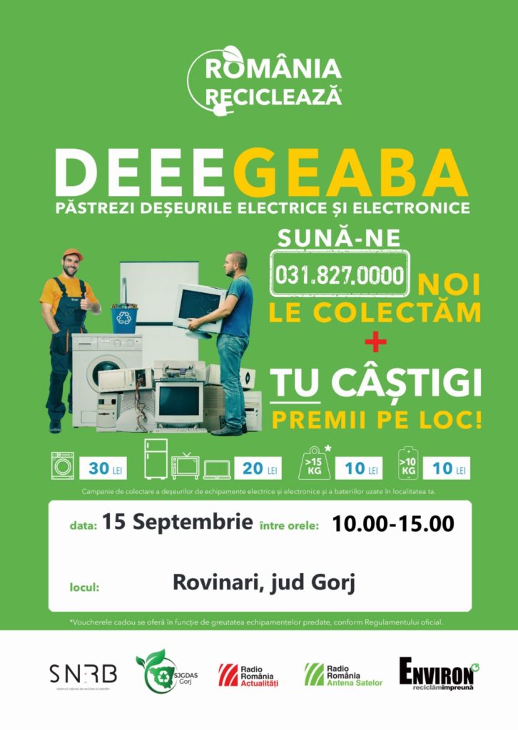 Astăzi, între orele 10:00- 15:00, are loc, în orașul Rovinari, o amplă campanie de strângere a electrocasnicelor vechi. ”Sună la numărul 031.827.0000 și cineva va veni la tine pentru a ridica electrocasnicele de care nu mai ai nevoie. Pentru fiecare deșeu electric sau electrocasnic predat veți primi vouchere de cumpărături”, au transmis organizatorii.