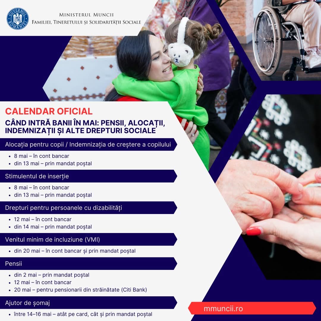 ”În aprilie, drepturile au fost plătite mai devreme pentru ca românii să se poată pregăti pentru Paști. 1 Mai, Ziua Muncii, este zi liberă pentru toți românii. Banii aferenți alocațiilor pentru copii, pensiilor și celorlalte prestații sociale vor ajunge la beneficiari în timp util, calendarul plăților fiind deja stabilit în acest sens”, a declarat Simona Bucura Oprescu, ministrul Muncii, Familiei, Tineretului și Solidarității Sociale.