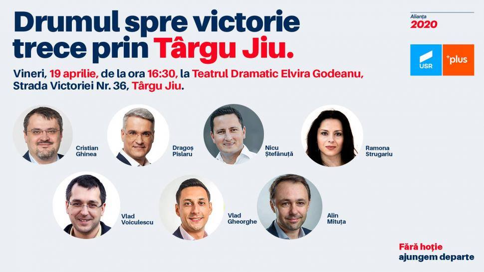 Zece dintre candidaţii Alianţei 2020 USR PLUS la alegerile europarlamentare vor veni în Gorj. Evenimentul „Drumul spre victorie trece prin Târgu Jiu” va avea loc vineri, 19 aprilie, de la ora 16.30, la Teatrul „Elvira Godeanu”.