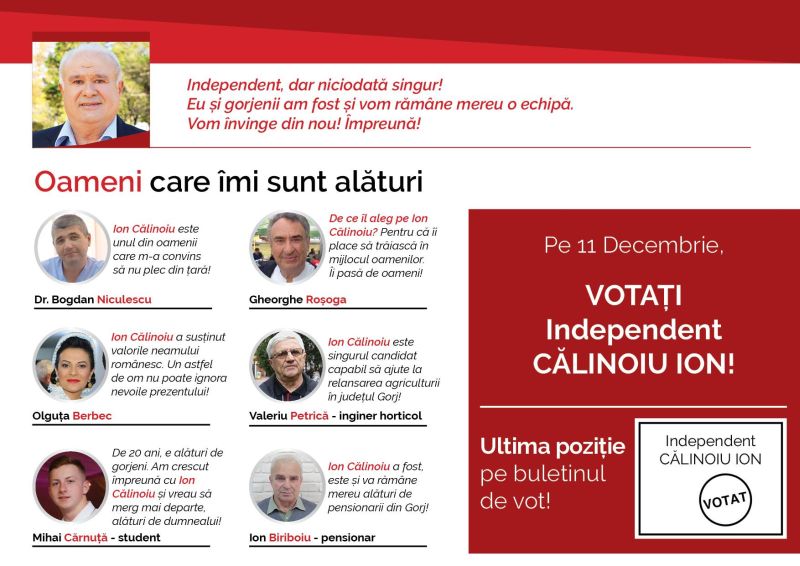 Acesta susține că este “Independent, dar niciodată singur!” fiind convins că gorjenii îi vor oferi votul lor pe 11 decembrie.