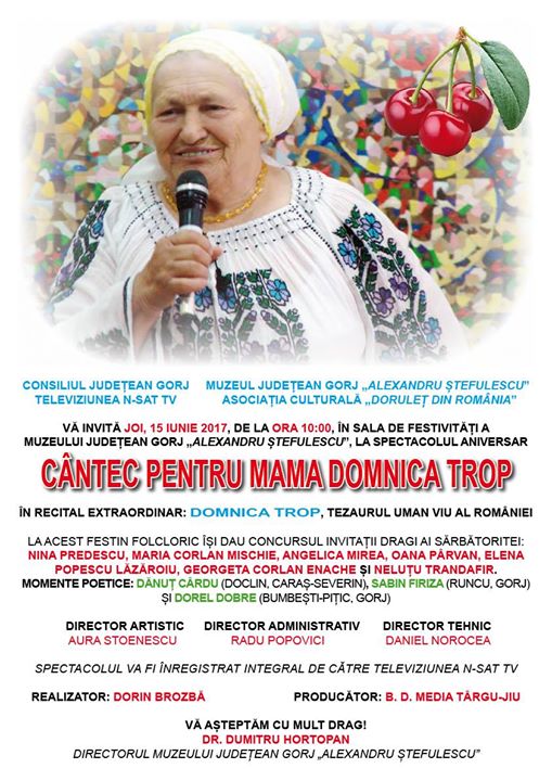Săptămâna viitoare, în data de 15 iunie, de la ora 10:00, în sala de festivităţi a Muzeului Judeţean “Alexandru Ştefulescu” din municipiul Târgu-Jiu, va avea loc spectacolul aniversar intitulat “Cântec pentru mama Domnica Trop”, un recital extraordinar ce va fi susţinut chiar de către interpreta de muzică populară Domnica Trop. Realizatorul evenimentului este publicistul gorjean Dorin Brozbă. Manifestarea este organizată de Consiliul Judeţean Gorj, Muzeul Judeţean “Alexandru Ştefulescu” şi Asociaţia Culturală “Doruleţ din România”.